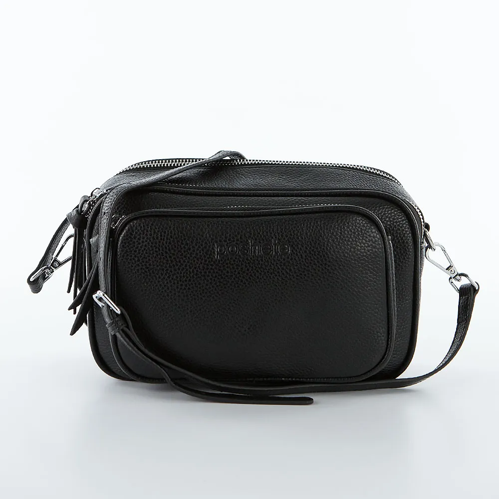 Сумка от торговой марки Poshete из натуральной кожи черного цвета. Модель со съемным регулируемым плечевым ремнем. Два отделения на молнии, с текстильной подкладкой. В одном из них – карман на молнии, в другом – накладной карман. На лицевой стороне – закругленный накладной карман на молнии. На задней стороне – карман на молнии.