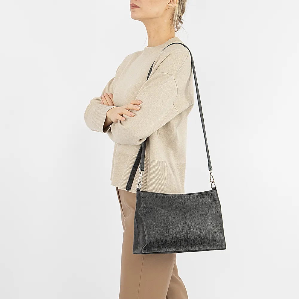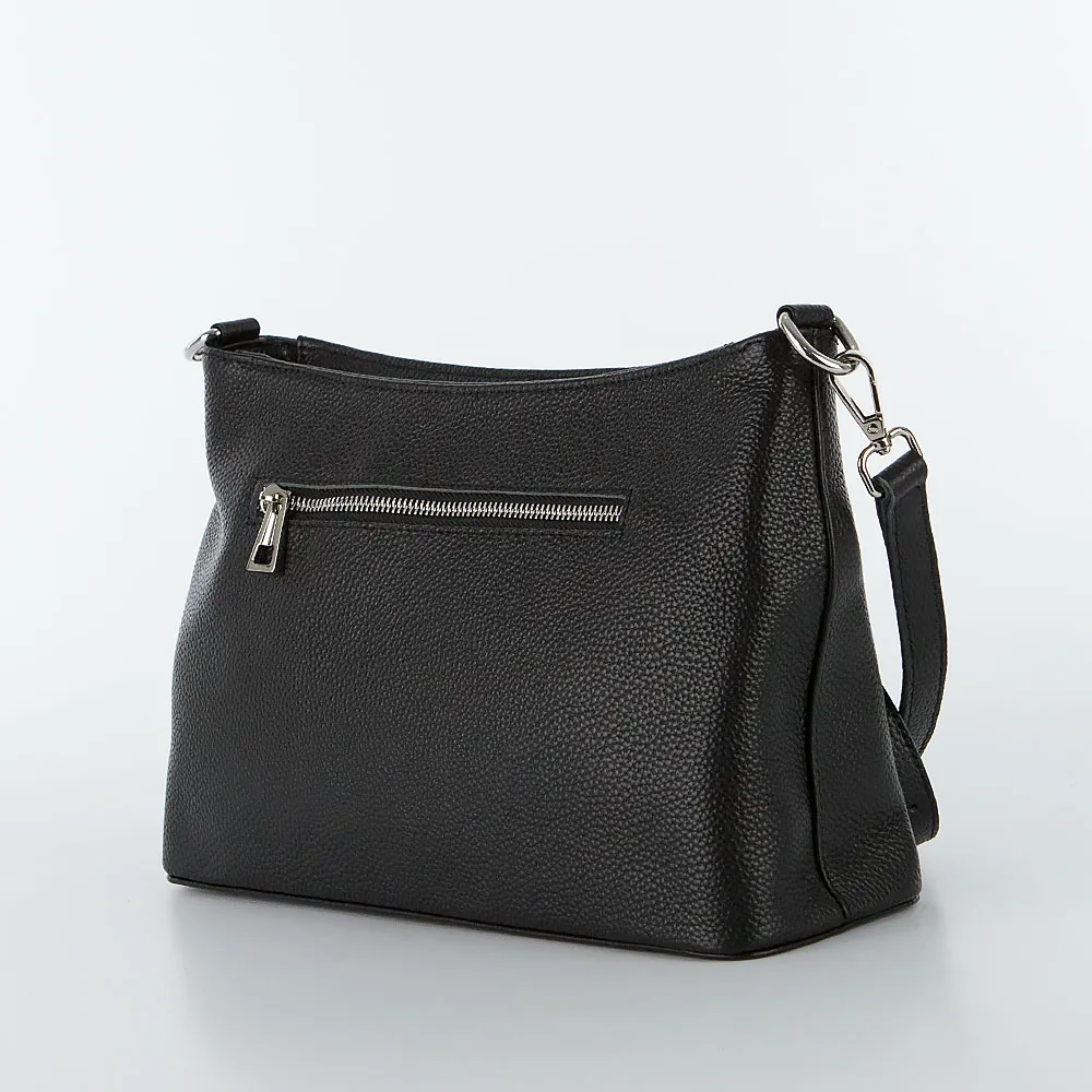 Сумка от торговой марки Poshete из натуральной кожи черного цвета. Модель со съемной ручкой и съемным регулируемым плечевым ремнем. Отделение на молнии. Внутри: фирменная подкладка, средник и карман на молнии, два накладных кармана. На задней стороне – карман на молнии. Дно оснащено металлическими ножками для защиты от износа.