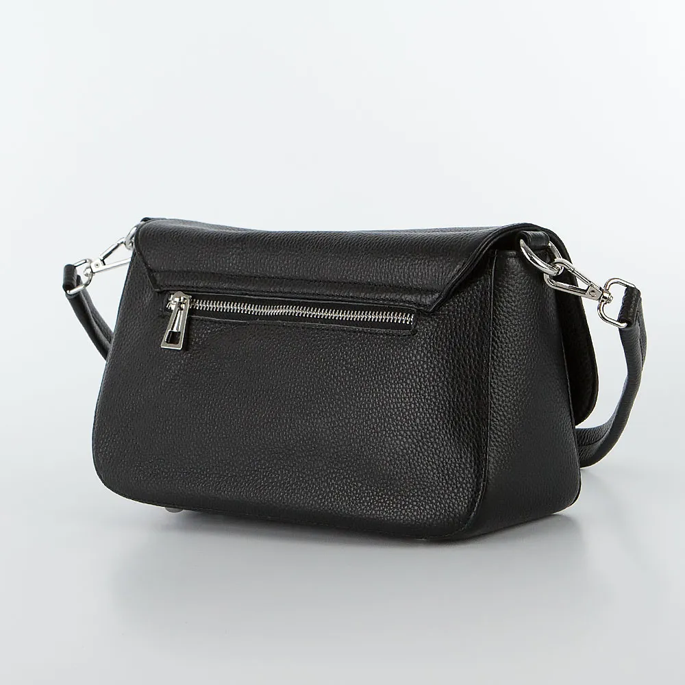 Сумка от торговой марки Poshete из натуральной кожи черного цвета. Модель со съемной ручкой и съемным регулируемым плечевым ремнем. Закрывается фигурным клапаном на двух магнитных кнопках. Отделение на молнии. Внутри: фирменная подкладка, средник и карман на молнии, накладной карман. На задней стороне – карман на молнии.