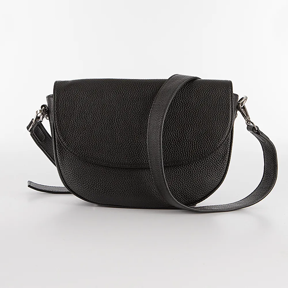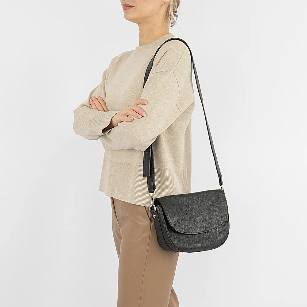 Сумка от торговой марки Poshete из натуральной кожи черного цвета. Модель с широким съемным регулируемым плечевым ремнем. Закрывается закругленным клапаном на магнитной кнопке. Отделение на молнии. Внутри: фирменная подкладка, средник и карман на молнии, накладной карман. На задней стороне – карман на молнии. Дно оснащено металлическими ножками для защиты от износа.