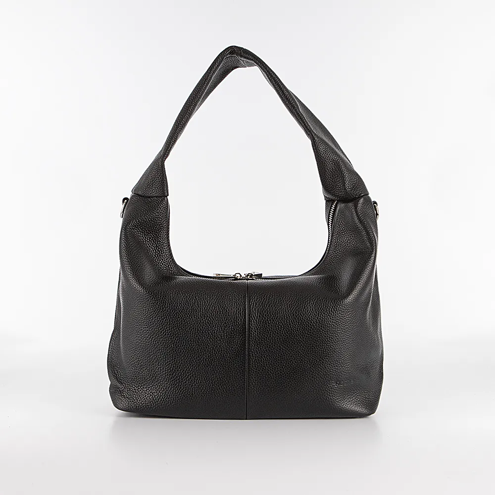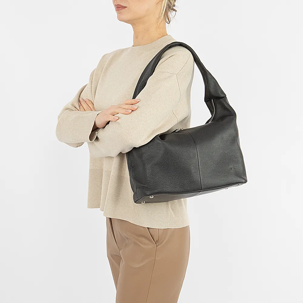Сумка от торговой марки Poshete из натуральной кожи черного цвета. Модель с одной широкой ручкой. Отделение на молнии. Внутри: фирменная подкладка, средник и карман на молнии, два накладных кармана. На задней стороне – карман на молнии. Дно оснащено металлическими ножами для защиты от износа.