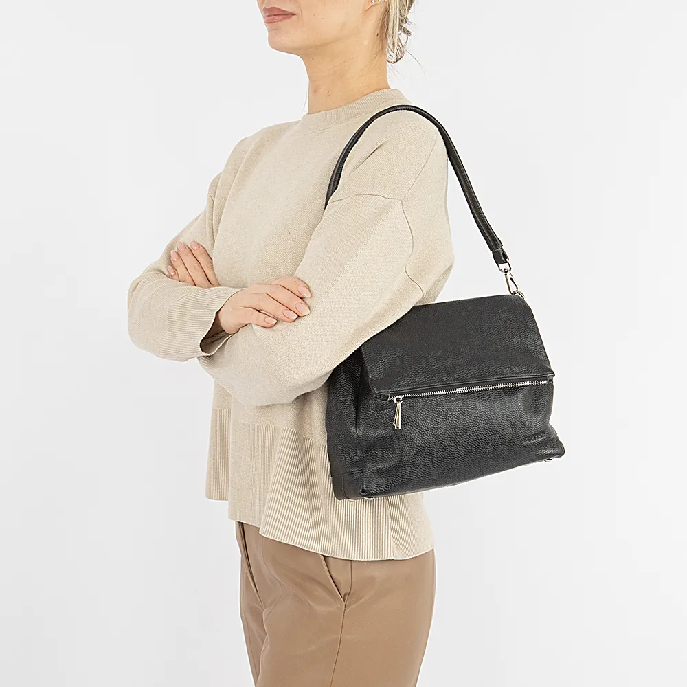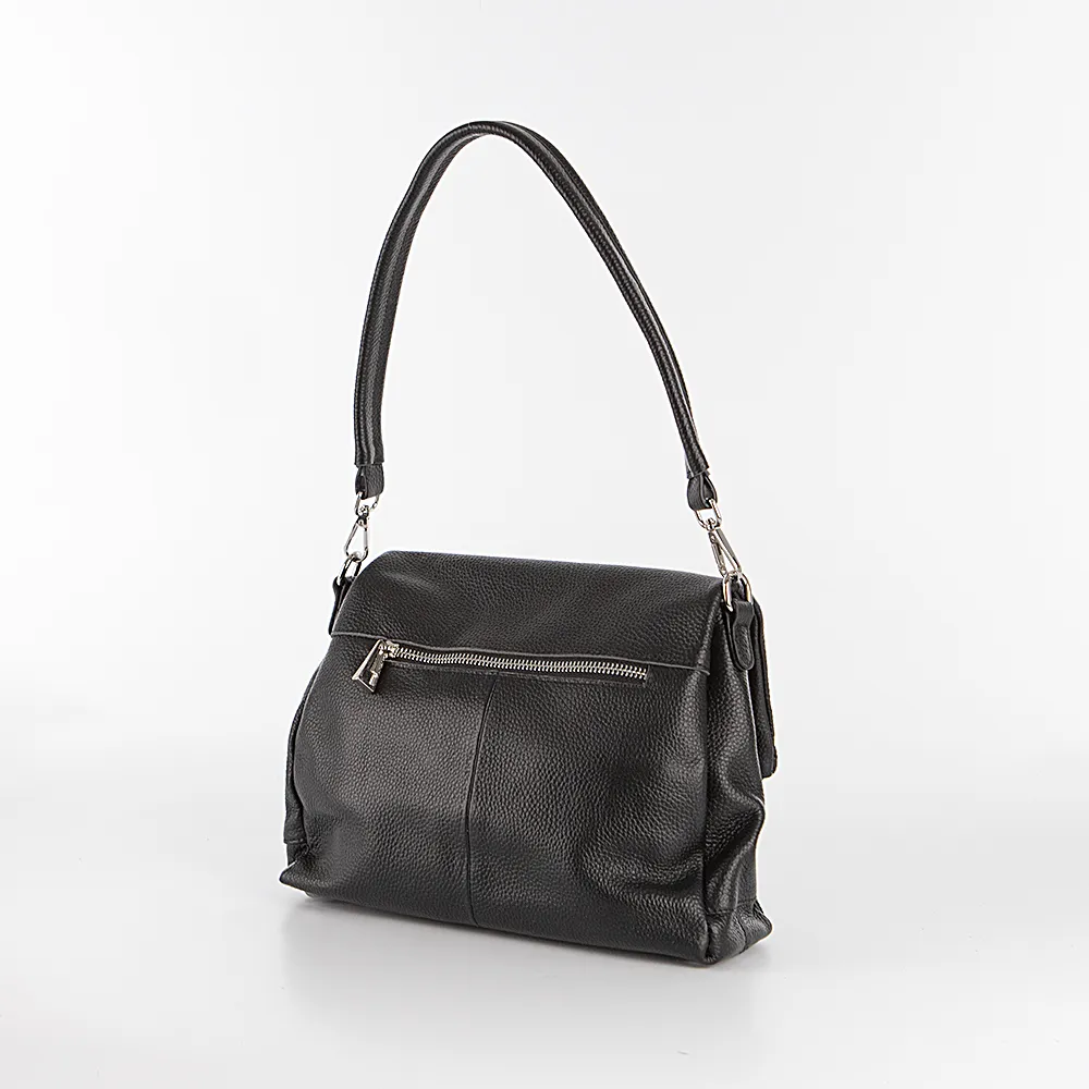 Сумка от торговой марки Poshete из натуральной зернистой кожи черного цвета. Практичная модель со съемной ручкой м съемным регулируемым плечевым ремнем. Клапан на двух магнитных кнопках с глубоким отделением на молнии закрывает три отделения на молнии. В среднем отделении – карман на молнии, два накладных кармана. На задней стороне – карман на молнии. Дно оснащено металлическими ножами для защиты от износа.