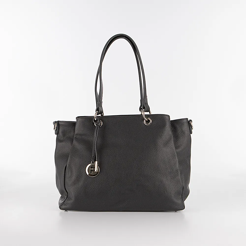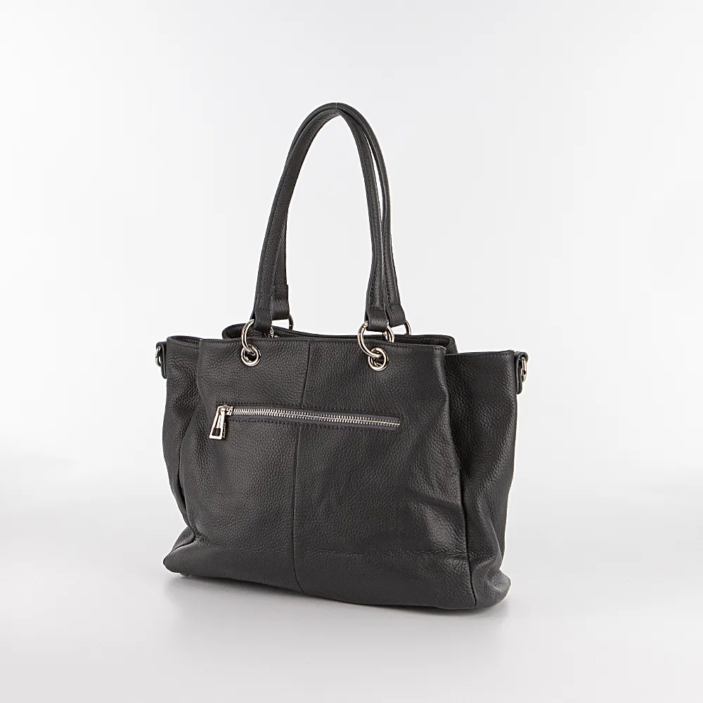 Сумка от торговой марки Poshete из натуральной кожи темно-серого цвета. Вместительная модель с двумя ручками, декорированными подвеской, и съемным регулируемым плечевым ремнем. Три отделения на молнии, с фирменной подкладкой. Среднее отделение широко раскрывается; внутри: карман на молнии, два накладных кармана. На задней стороне – карман на молнии. Дно оснащено металлическими ножами для защиты от износа.