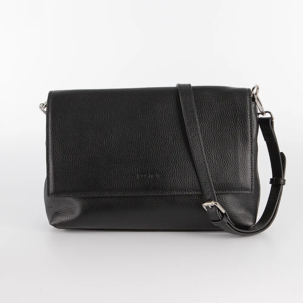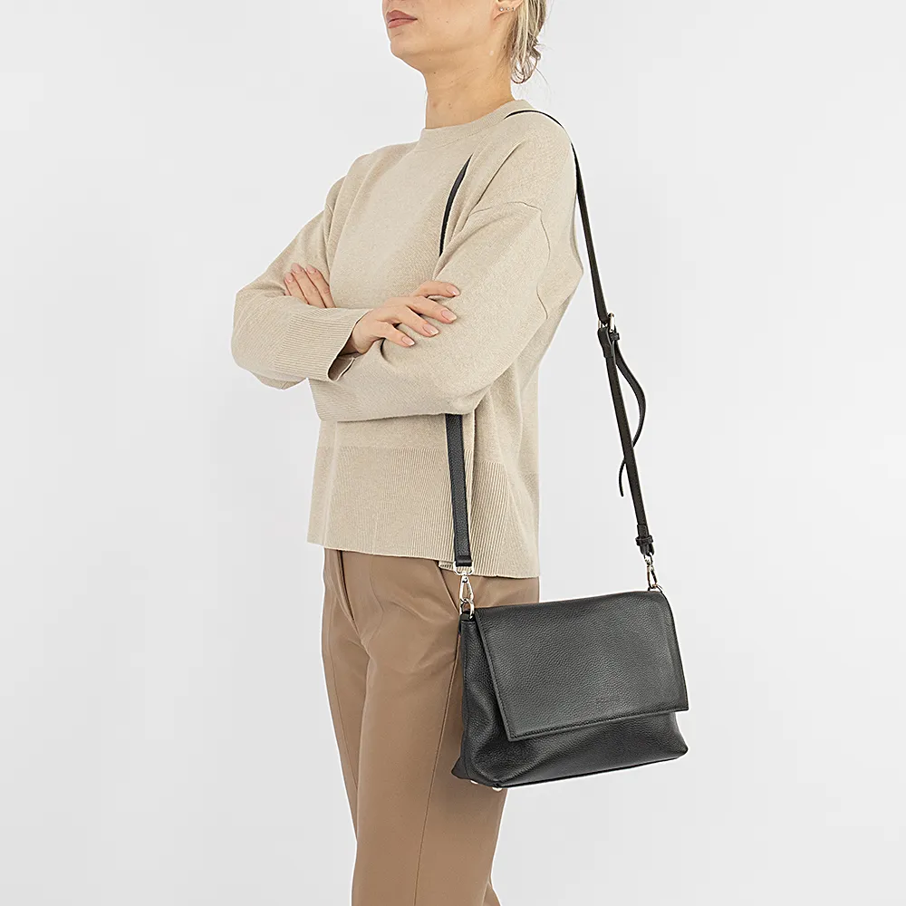 Сумка от торговой марки Poshete из натуральной кожи черного цвета. Модель со съемным регулируемым плечевым ремнем. Клапан на двух магнитных кнопках закрывает карман на молнии и отделение на молнии. В отделении: средник и карман на молнии, два накладных кармана. На задней стороне – карман на молнии.