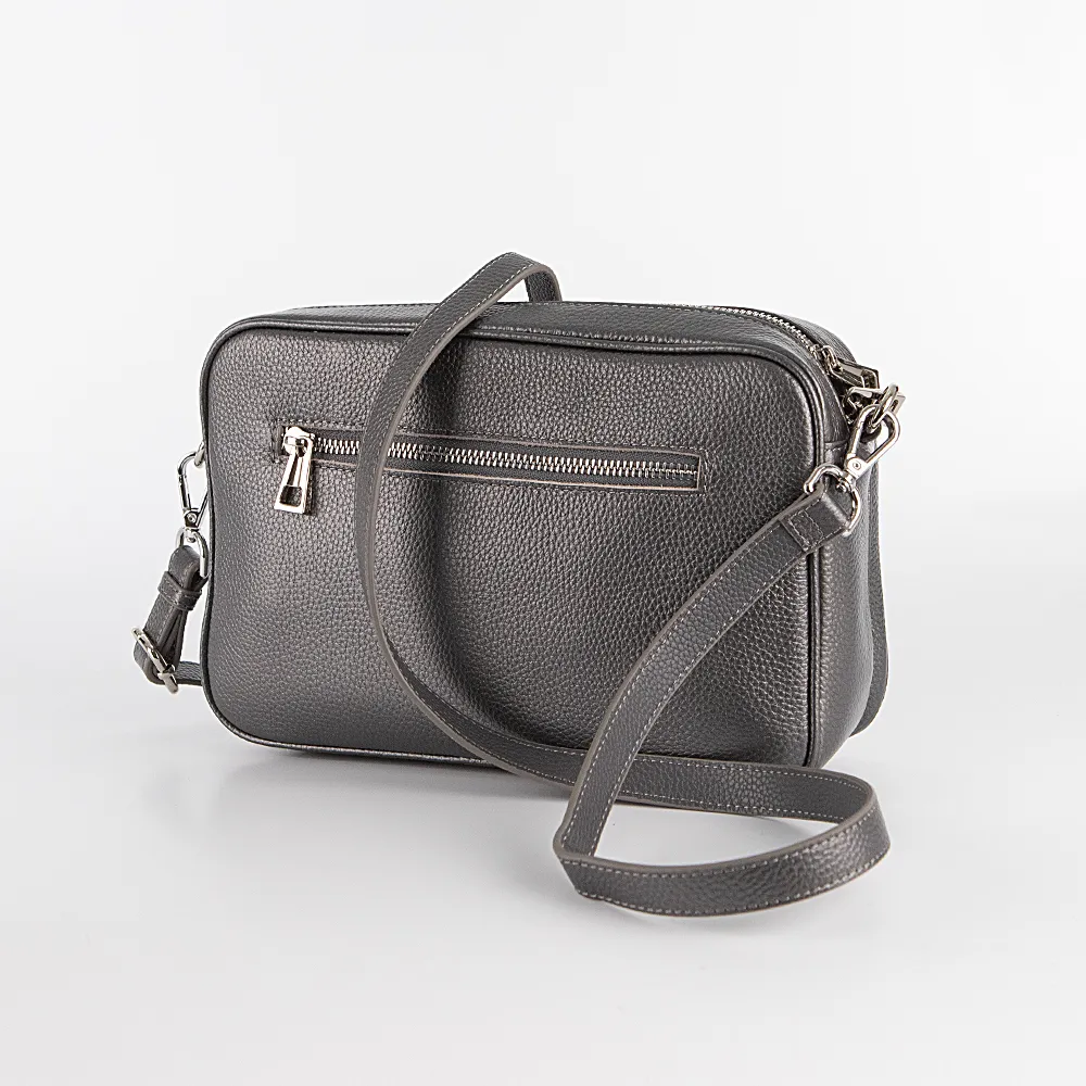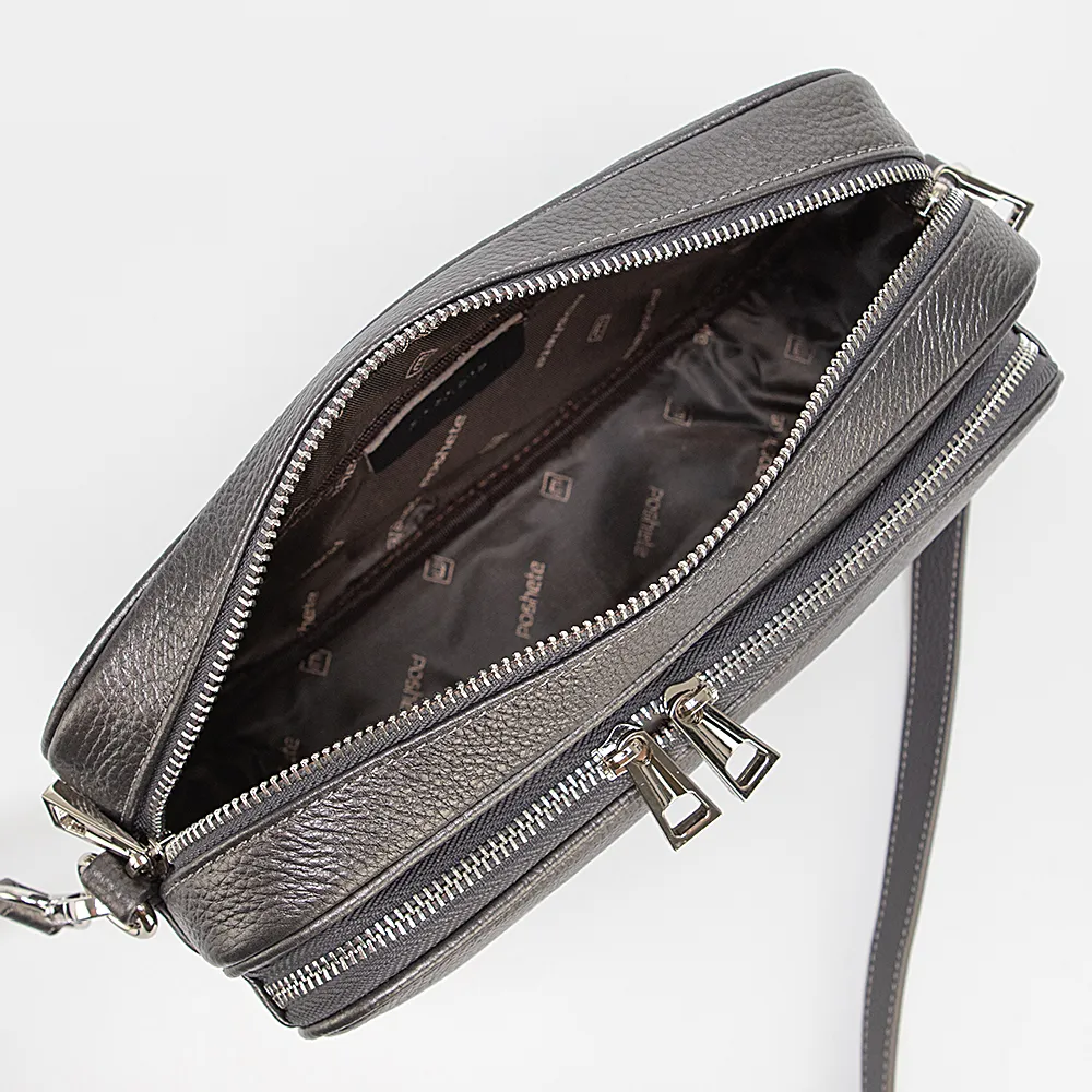 Сумка от торговой марки Poshete из натуральной кожи цвета «темное серебро». Модель со съемным регулируемым плечевым ремнем. Два отделения на молнии, с фирменной подкладкой. В основном отделении – карман на молнии, накладной карман. На задней стороне – карман на молнии.