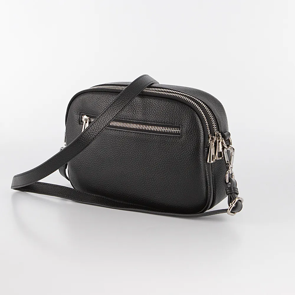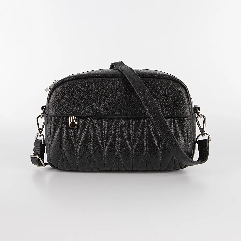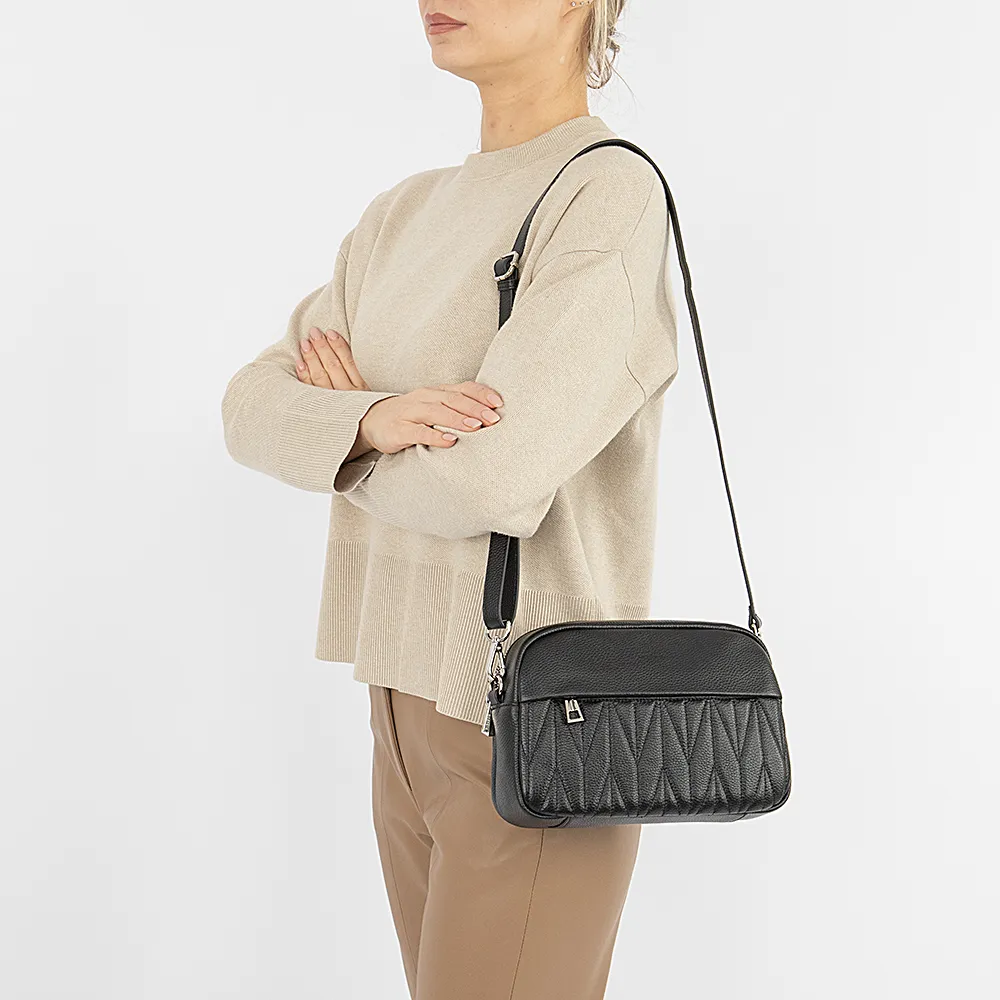 Сумка от торговой марки Poshete из натуральной кожи черного цвета. Лицевая сторона декорирована узорной стежкой. Модель со съемным регулируемым плечевым ремнем. Два отделения на молнии, с фирменной подкладкой. В одном из них – карман на молнии, в другом – накладной карман. На лицевой стороне – карман на скрытой молнии; на задней – карман на молнии.