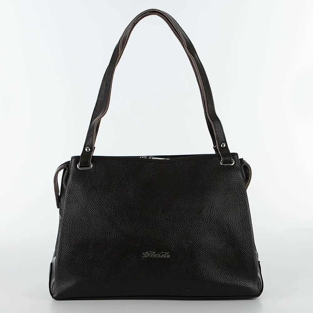Сумка от торговой марки Poshete из натуральной кожи темно-коричневого цвета. Модель с двумя удлиненными ручками и съемным регулируемым плечевым ремнем. Три отделения с текстильной подкладкой. Крайние фиксируются магнитной кнопкой. Среднее отделение на молнии, которая крепится по бокам магнитными кнопками. Внутри: фирменная подкладка, средник и карман на молнии, два накладных кармана. На задней стороне – карман на молнии.