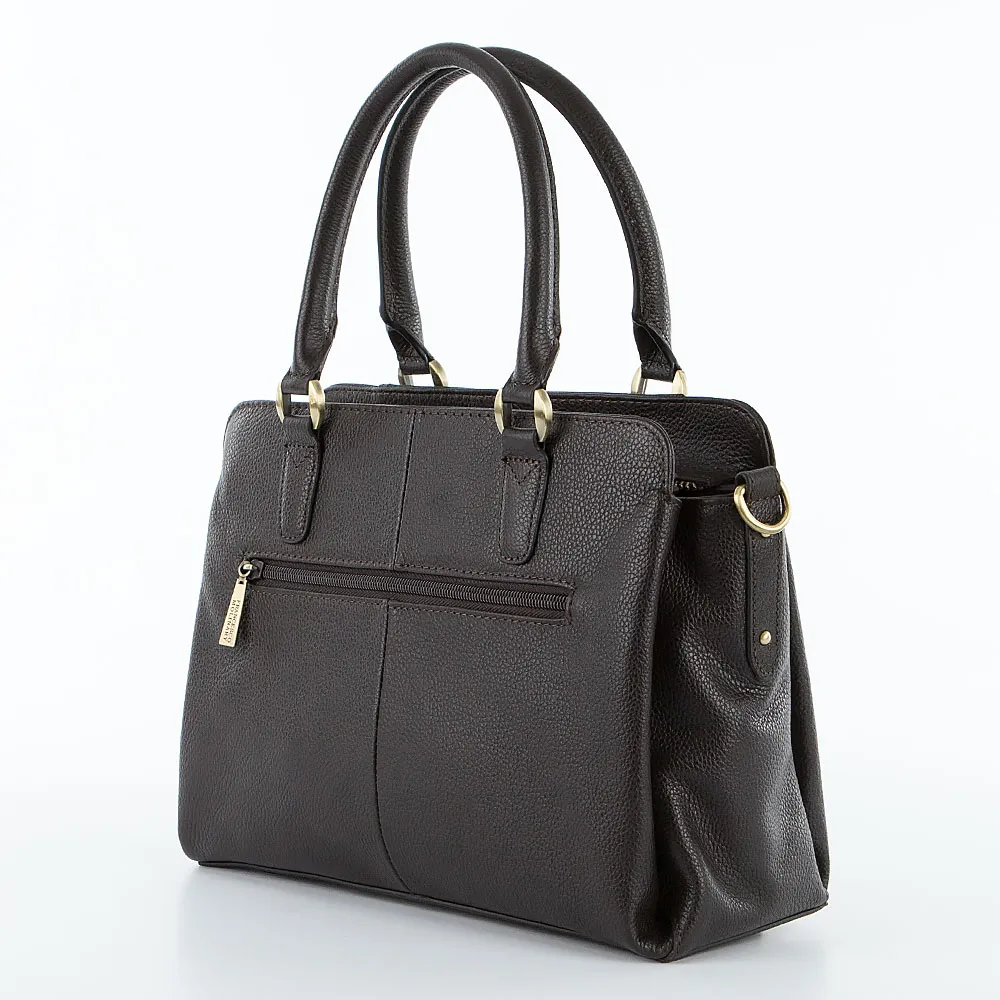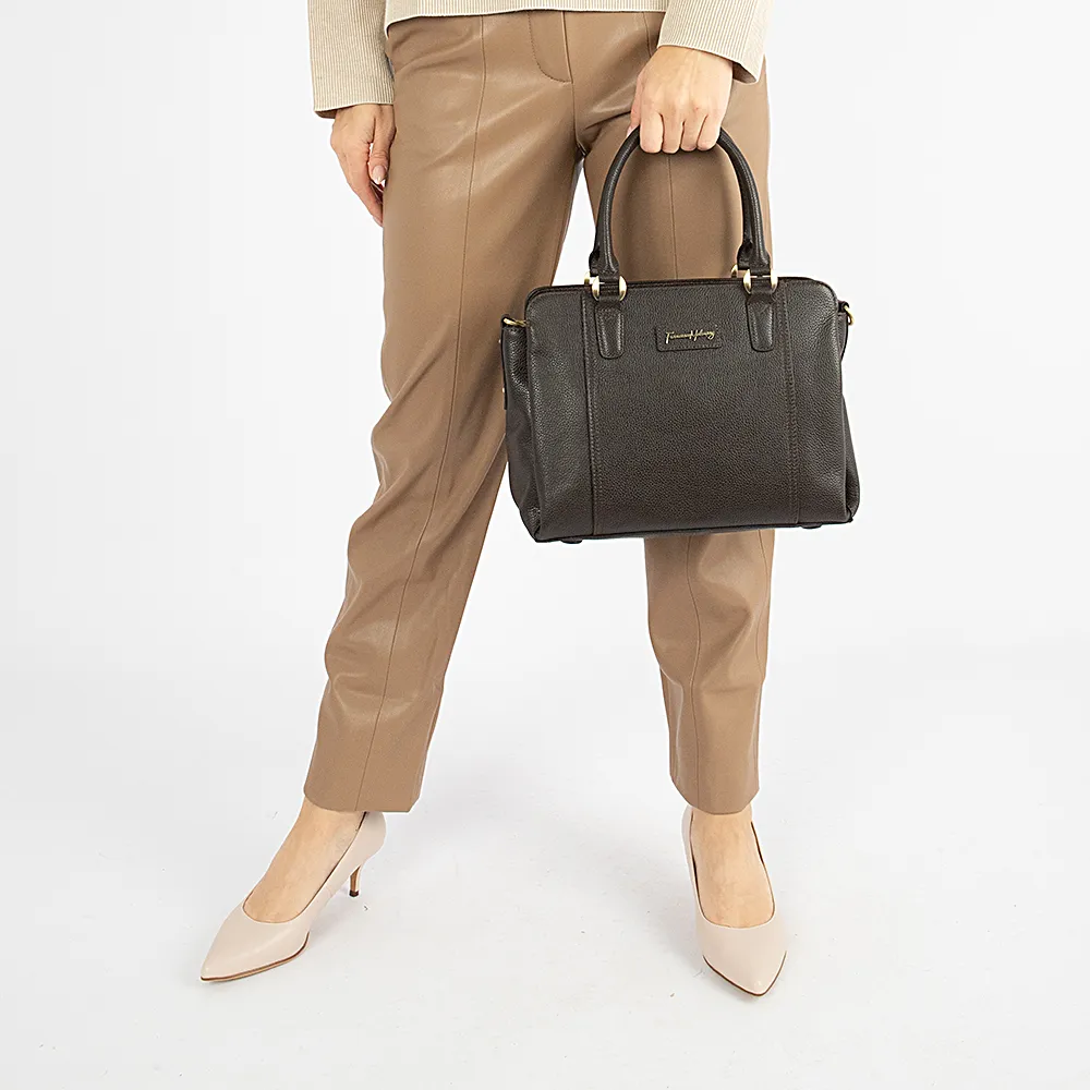 Превосходная сумка от торговой марки Francesco Molinary из натуральной кожи коричневого цвета. Компактная модель среднего размера с двумя ручками и съемным регулируемым плечевым ремнем. Закрывается молнией. Внутри: три отсека с фирменной подкладкой; в среднем отсеке – карман на молнии, накладной карман. На задней стороне – карман на молнии. На дне имеются кожаные нашивки для защиты от износа.