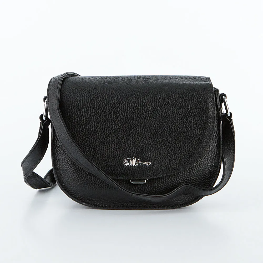 Сумка от торговой марки Francesco Molinary изготовлена из натуральной кожи черного цвета. Элегантная компактная модель с несъемным регулируемым плечевым ремнем. Закругленный клапан на цупферном замке закрывает накладной карман на кнопке и отделение. Внутри: фирменная подкладка, средник и карман на молнии, накладной карман. На задней – карман на молнии. Дно сумки оснащено металлическими ножками от износа.
