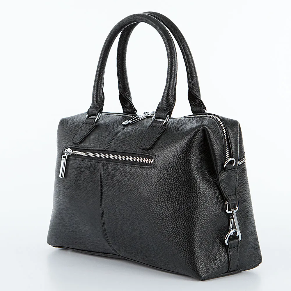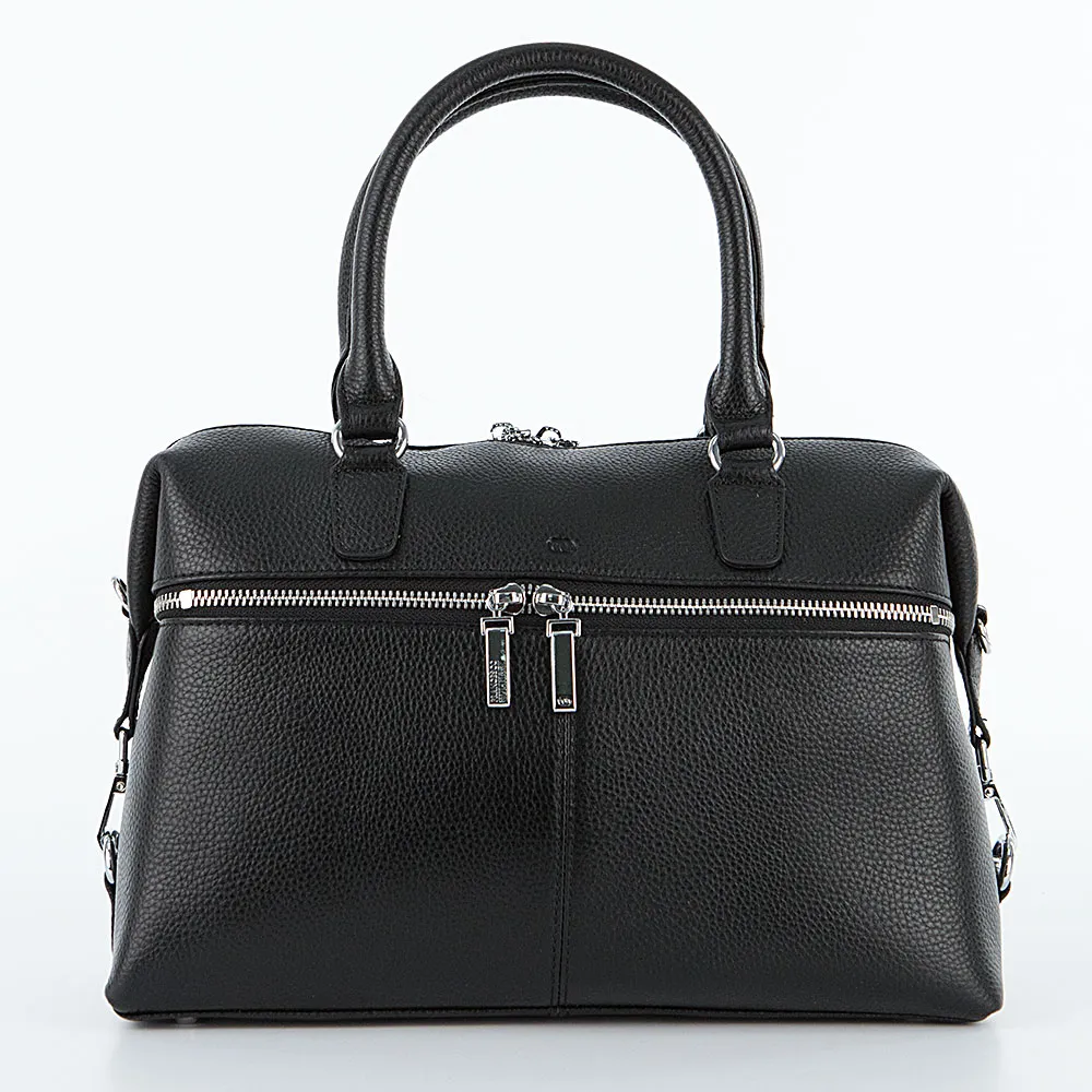 Сумка от торговой марки Francesco Molinary из натуральной кожи черного цвета. Модель с двумя ручками и съемным регулируемым плечевым ремнем. Отделение на молнии с двумя встречными бегунками. Внутри: фирменная подкладка, средник и карман на молнии, два накладных кармана. По бокам – карабины, с помощью которых можно менять объем и форму сумки. На лицевой и задней сторонах – карман на молнии. Дно сумки оснащено металлическими ножками от износа.
