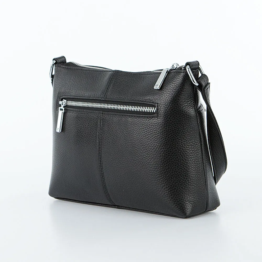 Сумка от торговой марки Francesco Molinary из натуральной кожи черного цвета. Компактная модель с несъемным регулируемым плечевым ремнем. Отделение на молнии. Внутри: фирменная подкладка, средник и карман на молнии, два накладных кармана. На лицевой стороне – карман на молнии, два накладных кармана на кнопке. На задней стороне – карман на молнии.
