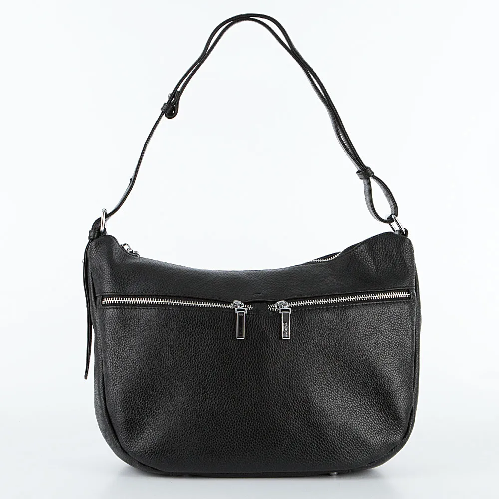 Сумка от торговой марки Francesco Molinary из натуральной кожи черного цвета. Модель с несъемным регулируемым плечевым ремнем. Отделение на молнии. Внутри: фирменная подкладка, средник и карман на молнии, два накладных кармана. На лицевой стороне – два кармана на молнии. На задней стороне – карман на молнии. Дно сумки оснащено металлическими ножками от износа.