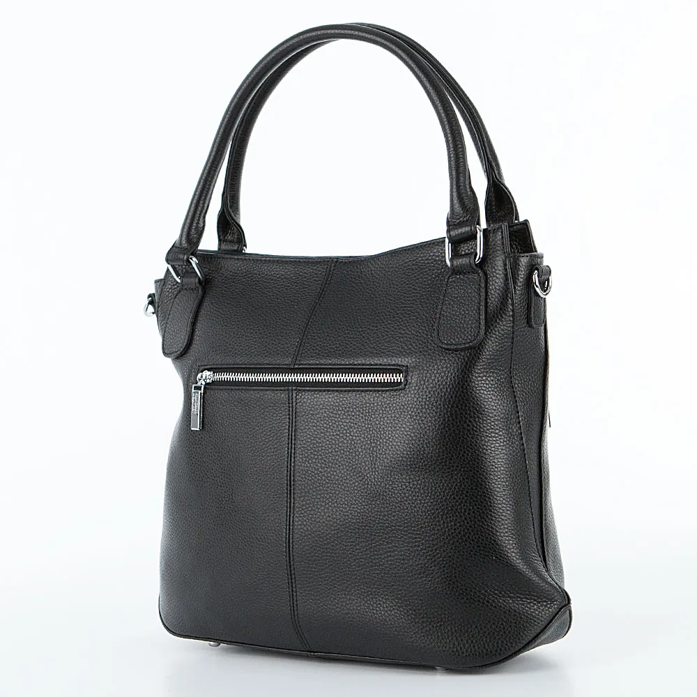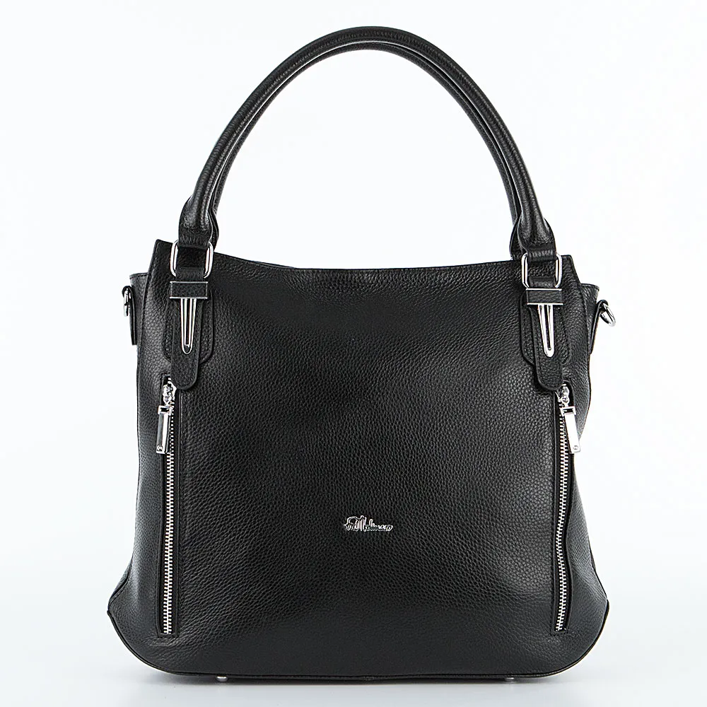 Сумка от торговой марки Francesco Molinary из натуральной кожи черного цвета. Модель с двумя ручками и съемным регулируемым плечевым ремнем. Отделение на молнии. Внутри: фирменная подкладка, средник и карман на молнии, два накладных кармана. На лицевой стороне – два вертикальных кармана на молнии. На задней стороне – карман на молнии. Дно сумки оснащено металлическими ножками от износа.