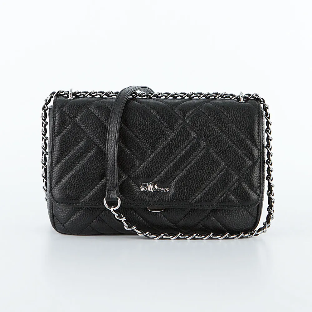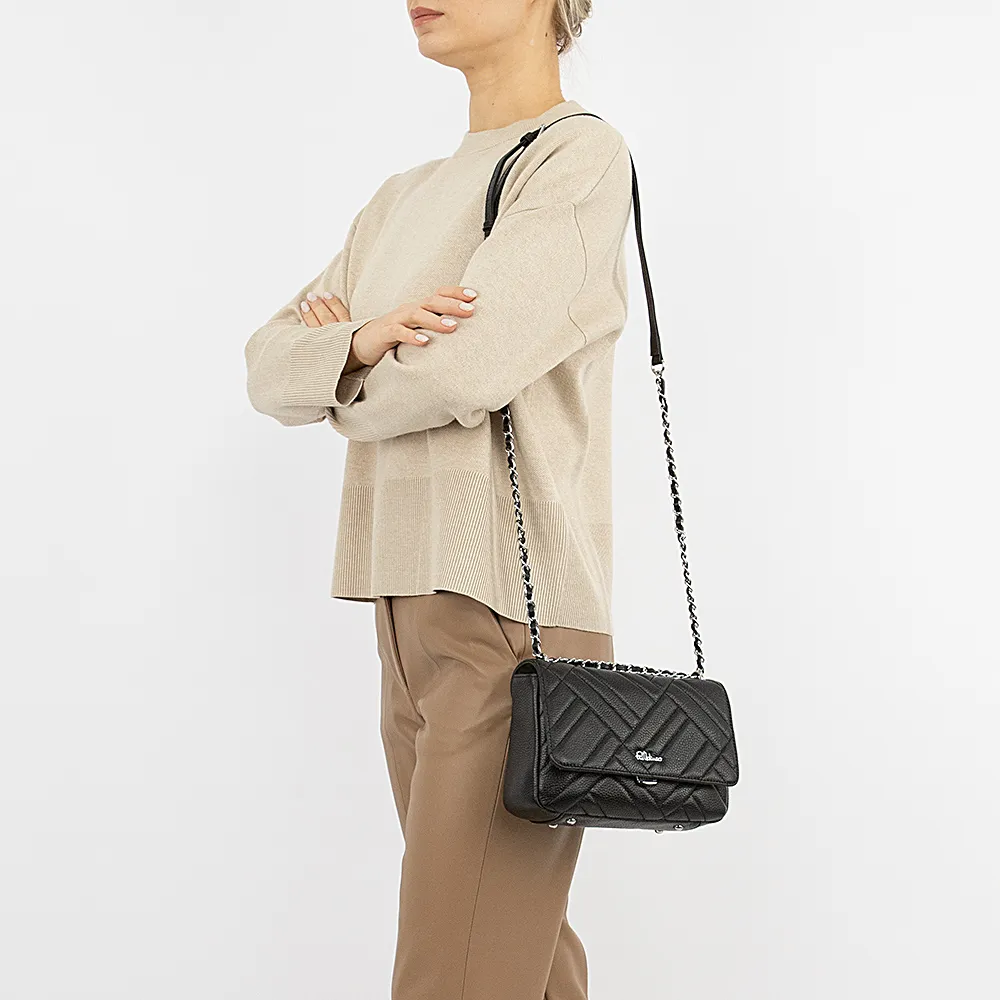 Сумка от торговой марки Francesco Molinary из натуральной кожи черного цвета с декоративной стежкой. Модель с ручкой-цепочкой. Закрывается клапаном на цупферном замке. В отделении: фирменная подкладка, средник и карман на молнии, накладной карман. На задней стороне – карман на молнии. Дно сумки оснащено металлическими ножками от износа.
