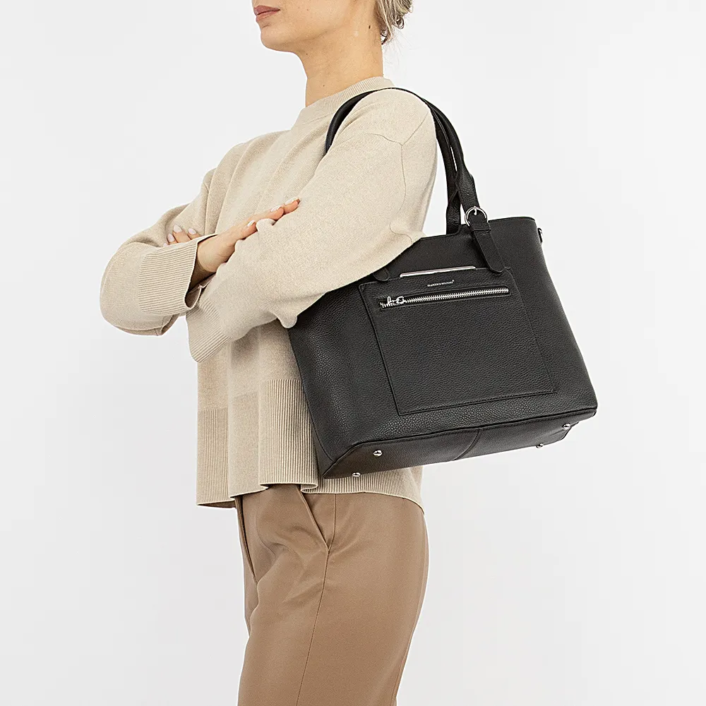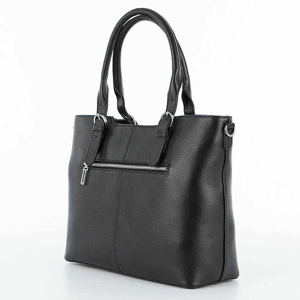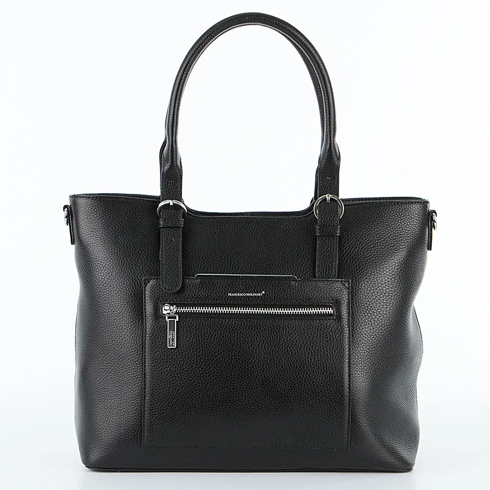 Сумка от торговой марки Francesco Molinary из натуральной кожи черного цвета. Вместительная модель с двумя регулируемыми ручками и съемным регулируемым плечевым ремнем. Отделение на молнии. Внутри: фирменная подкладка, средник и карман на молнии, два накладных кармана. На лицевой стороне – накладной карман на скрытом магните, карман на молнии. На задней стороне – карман на молнии. Дно сумки оснащено металлическими ножками от износа.