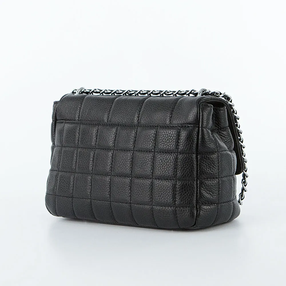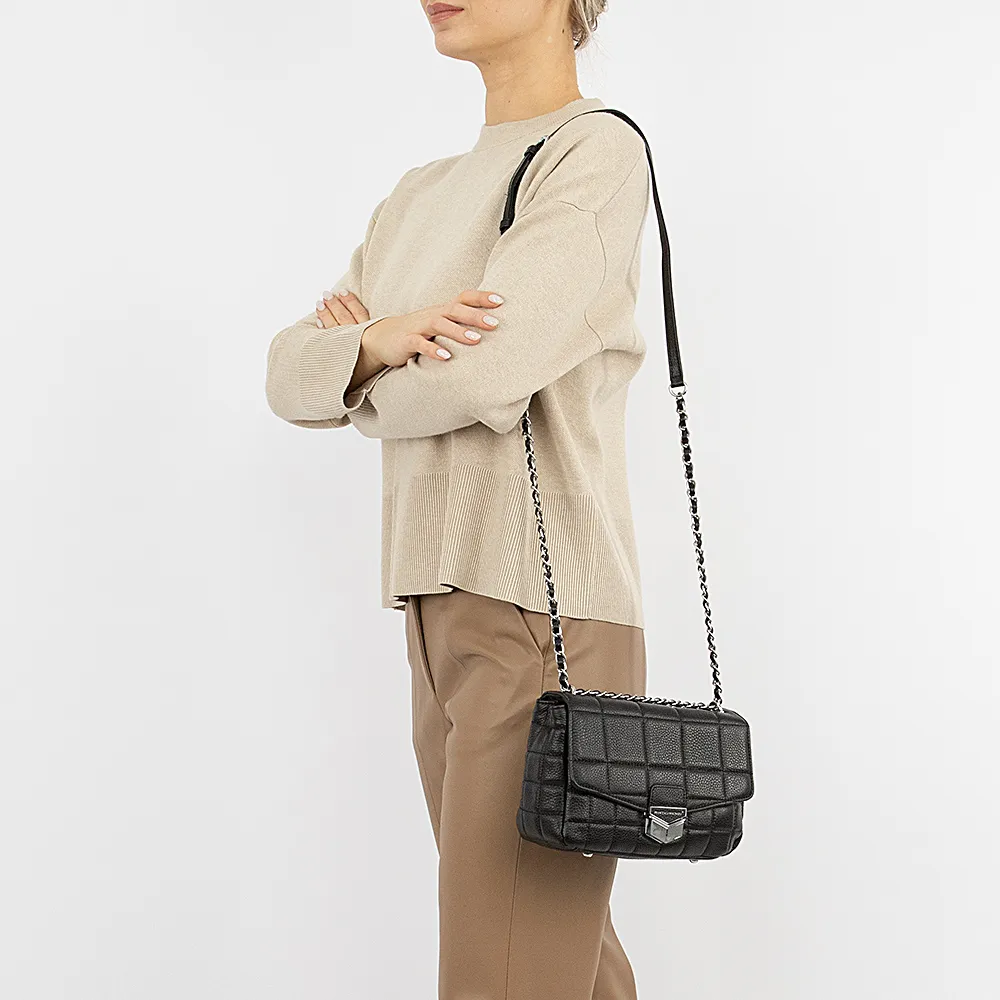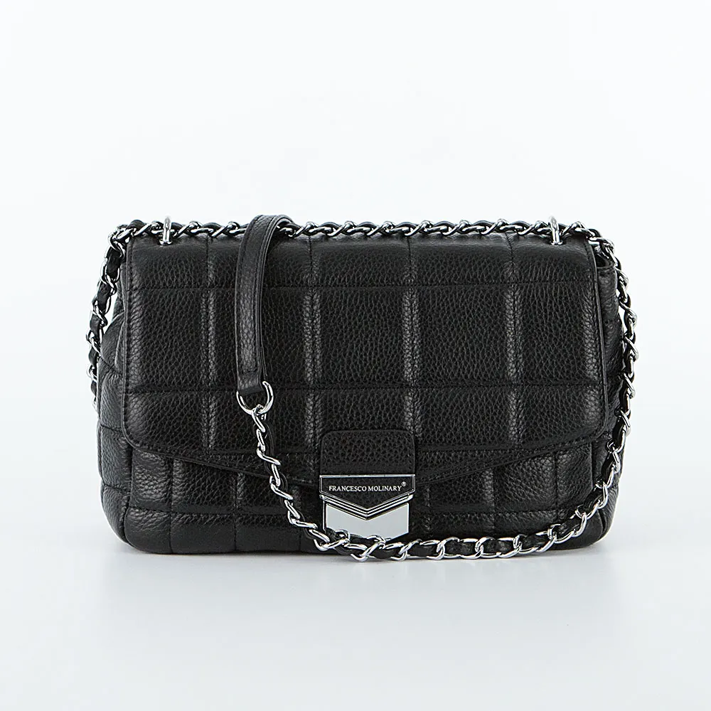 Сумка от торговой марки Francesco Molinary из натуральной кожи черного цвета с декоративной квадратной стежкой. Модель с ручкой-цепочкой. Закрывается клапаном на цупферном замке. В отделении: фирменная подкладка, средник и карман на молнии, накладной карман. На задней стороне – накладной карман на магнитной кнопке. Дно сумки оснащено металлическими ножками от износа.