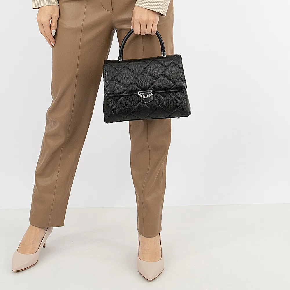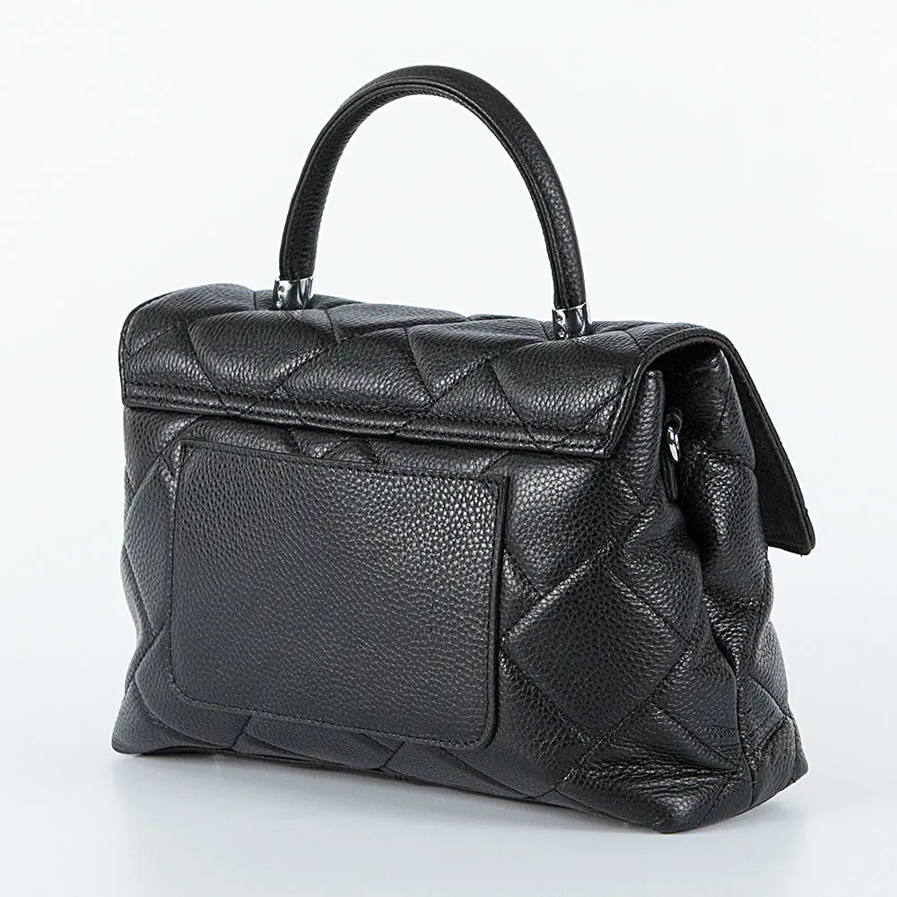 Сумка от торговой марки Francesco Molinary из натуральной кожи черного цвета с ромбовидной стежкой. Модель с одной ручкой и съемным регулируемым плечевым ремнем. Закрывается клапаном на цупферном замке. Внутри: два отделения. В заднем – карман на молнии, в переднем – накладной карман. На задней стороне – накладной карман без застежки. Дно сумки оснащено металлическими ножками от износа.
