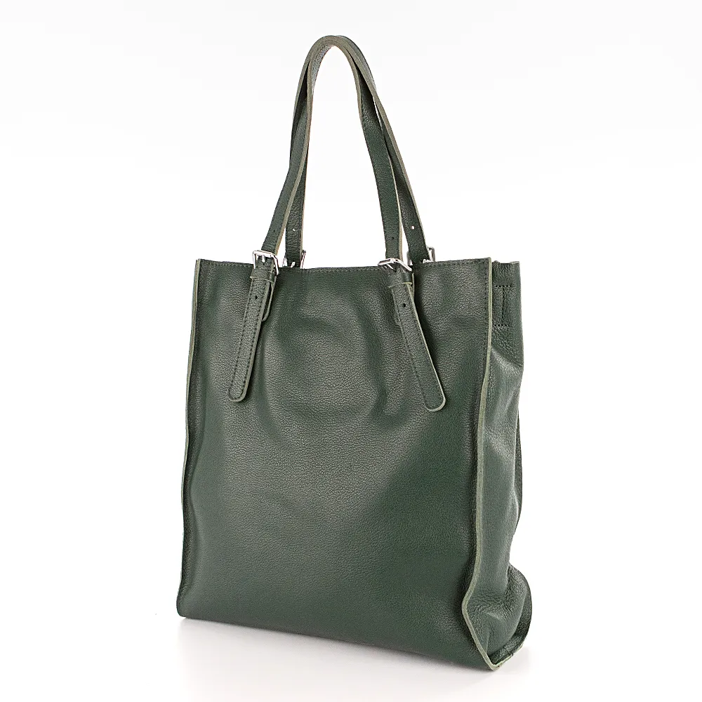 Сумка от торговой марки Poshete из натуральной кожи зеленого цвета. Модель с двумя регулируемыми ручками и съемным плечевым ремнем. Глубокое отделение на молнии. Внутри: без подкладки, накладной карман на молнии. Дно оснащено металлическими ножками для защиты от износа.