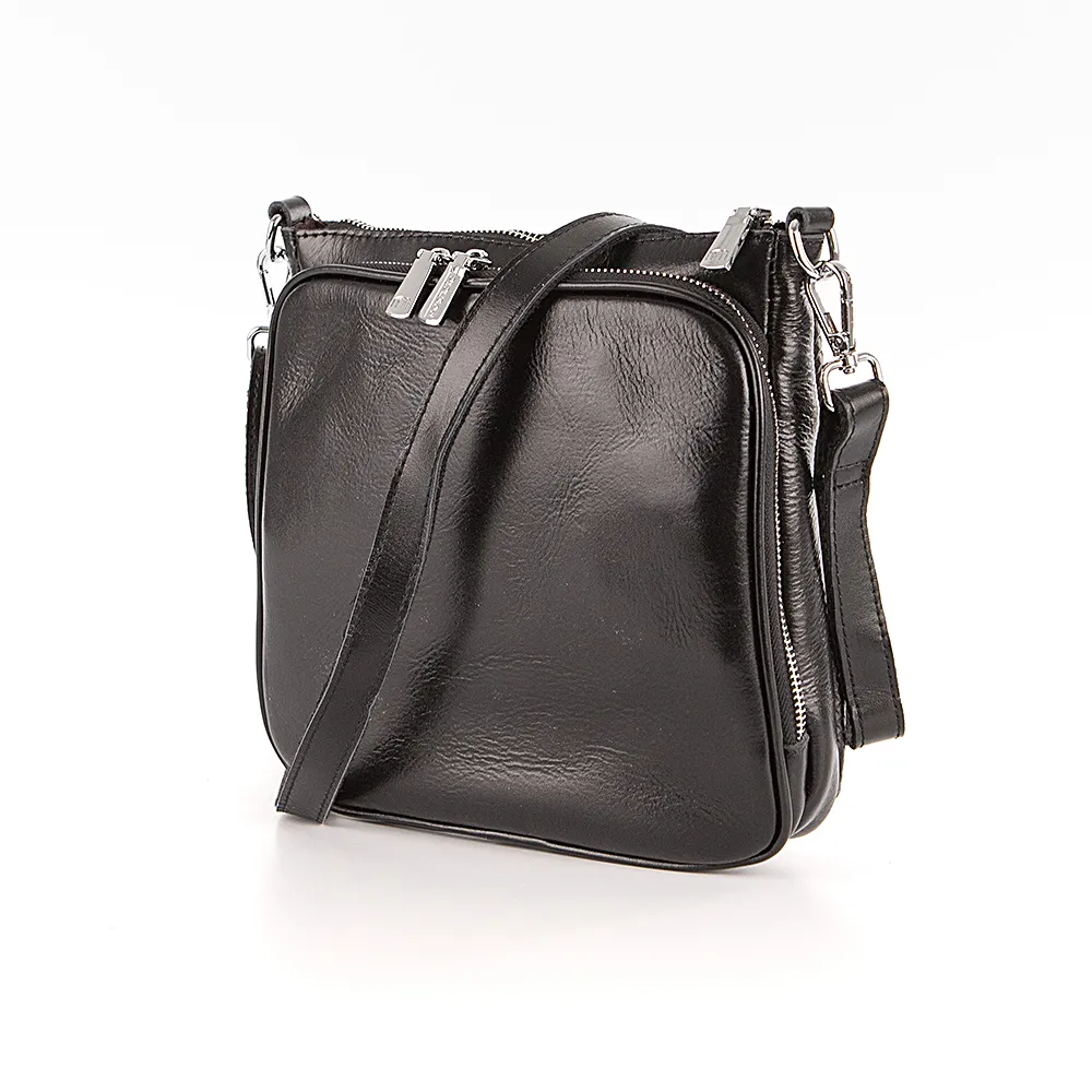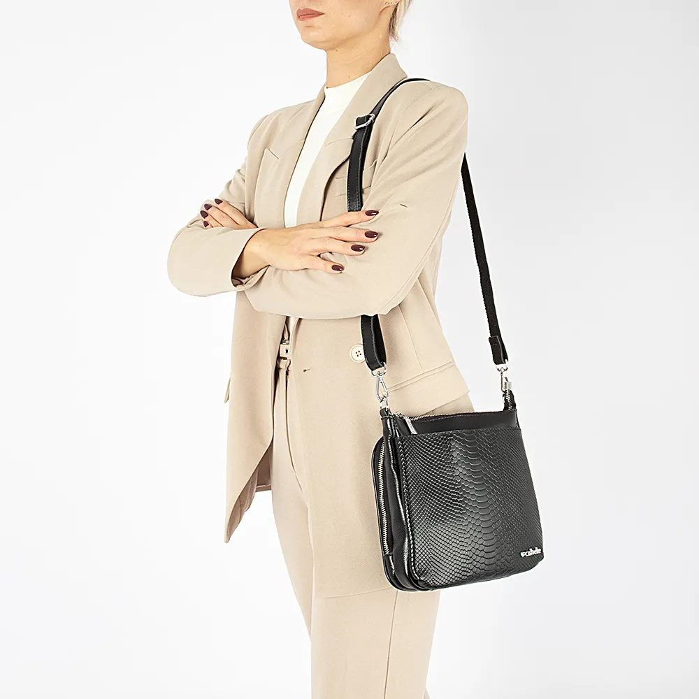 Сумка от торговой марки Poshete из натуральной кожи черного цвета. Передний карман декорирован тиснением под крокодиловую кожу. Модель со съемной ручкой, съемным регулируемым плечевым ремнем. Отделение на молнии. Внутри: текстильная подкладка, карман на молнии, накладной карман. На лицевой и задней сторонах – карман на молнии. Вместительный задний карман широко раскрывается, обеспечивая удобный доступ.