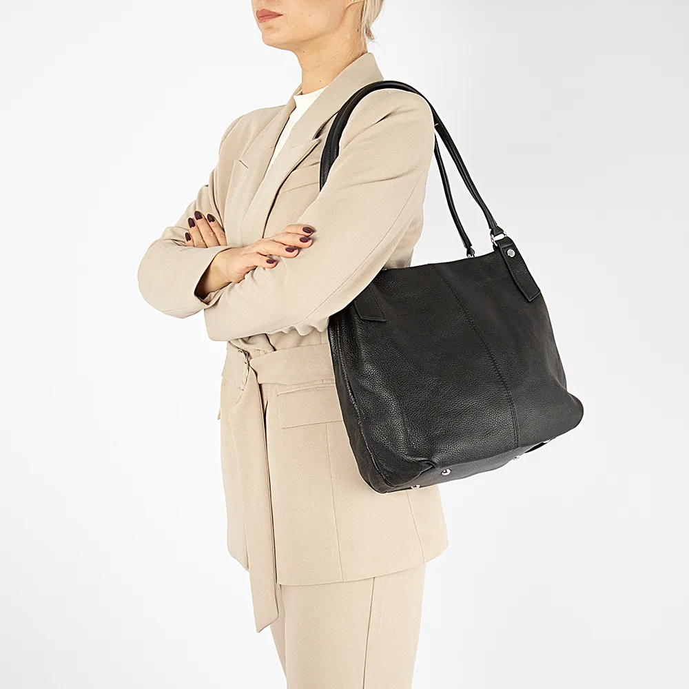 Сумка от торговой марки Poshete из натуральной кожи черного цвета. Модель с двумя удлиненными ручками. Отделение на молнии. Внутри: фирменная подкладка, средник и карман на молнии, накладной карман. На задней стороне – карман на молнии. Дно оснащено металлическими ножками для защиты от износа.