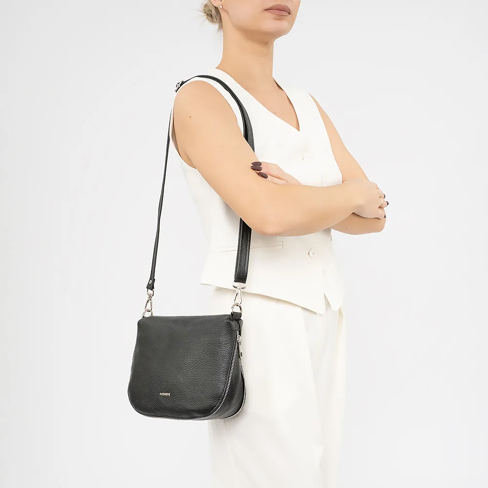 Сумка от торговой марки Poshete из натуральной кожи черного цвета. Модель со съемным регулируемым плечевым ремнем. Отделение на молнии. Внутри: фирменная подкладка, карман на молнии, накладной карман. На задней стороне – карман на молнии. По нижнему краю имеется молния для увеличения объема, также выполняющая декоративную роль.