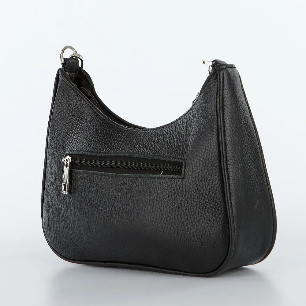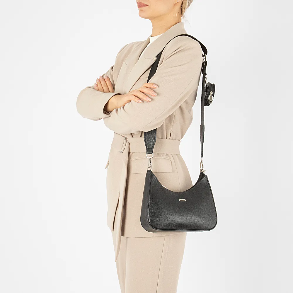 Сумка от торговой марки Poshete из натуральной кожи черного цвета. Модель с широким съемным регулируемым плечевым ремнем, выполненным из текстильного материала. Отделение на молнии. Внутри: фирменная подкладка, карман на молнии, накладной карман. На задней стороне – карман на молнии. В комплекте – круглый кошелек с отделением на молнии.