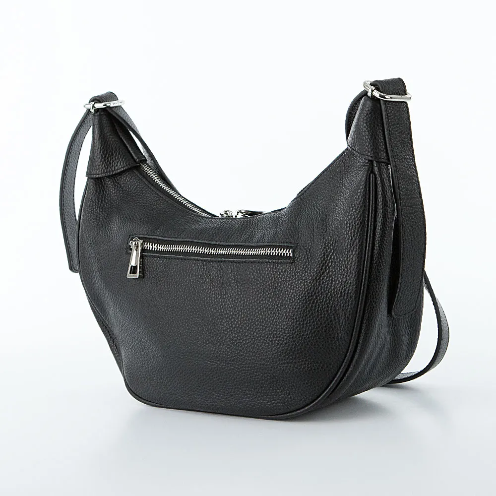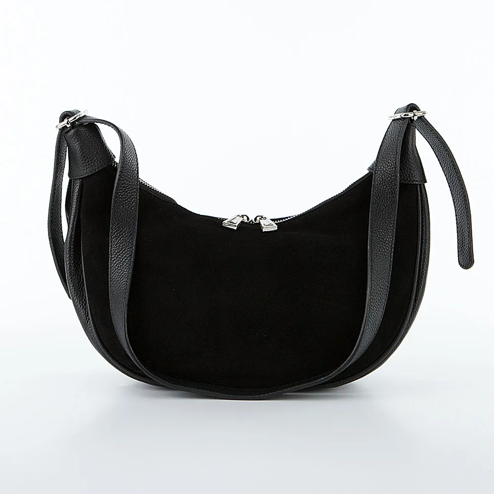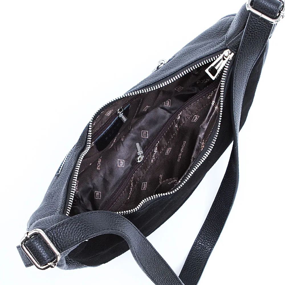 Сумка от торговой марки Poshete из натуральной кожи и замши черного цвета. Модель со съемным плечевым ремнем. Отделение на молнии. Внутри: фирменная подкладка, средник и карман на молнии, накладной карман. На задней стороне – карман на молнии.