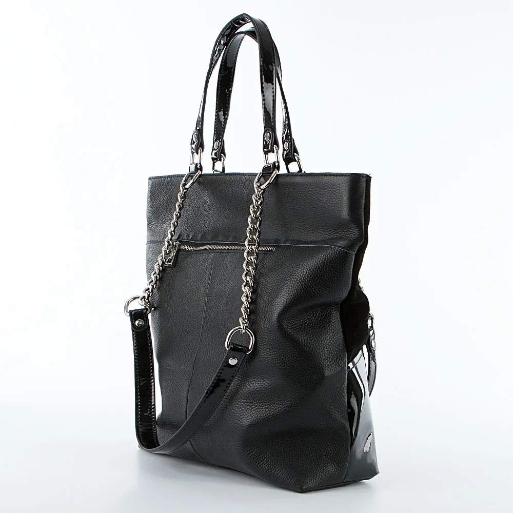 Сумка от торговой марки Poshete из натуральной кожи и замши черного цвета. Лицевая сторона декорирована лакированной и замшевой вставкой. Модель с двумя короткими лакированными ручками и двумя удлиненными ручками-цепочками. Отделение на молнии. Внутри: фирменная подкладка, средник и карман на молнии, два накладных кармана. На задней стороне – карман на молнии.