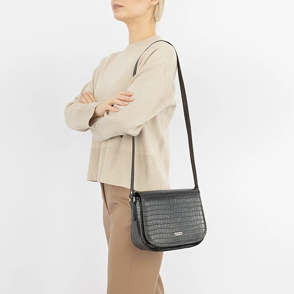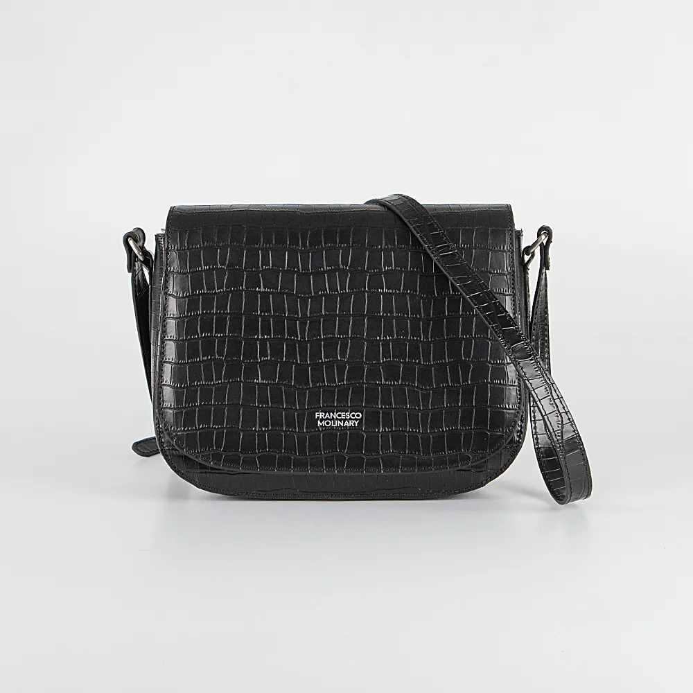 Сумка от торговой марки Francesco Molinary из натуральной кожи черного цвета с тиснением под крокодиловую кожу. Модель с несъемным регулируемым плечевым ремнем. Закрывается клапаном на магнитной кнопке. Внутри: фирменная подкладка, средник и карман на молнии. На задней стенке – карман на молнии.