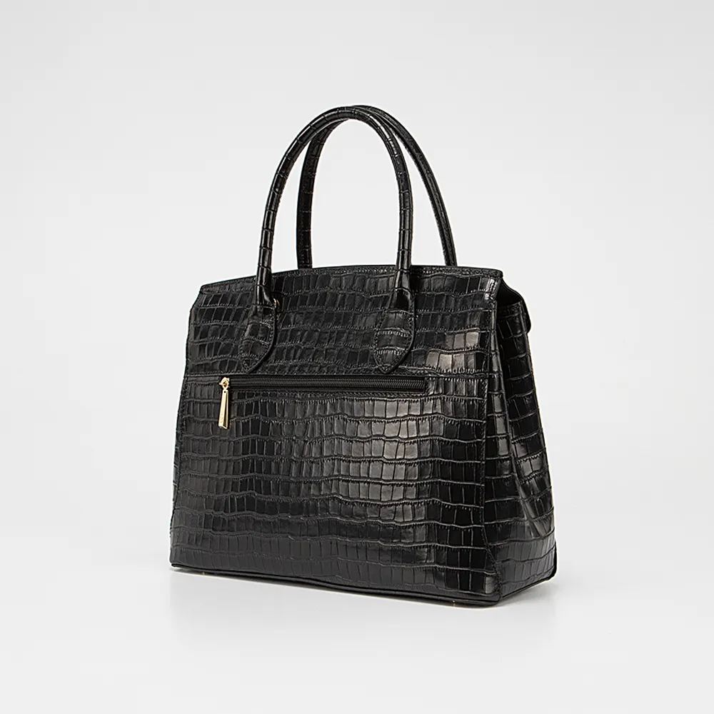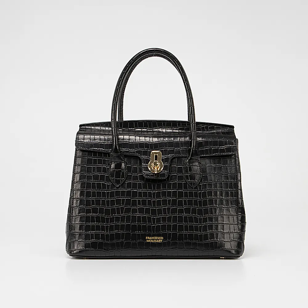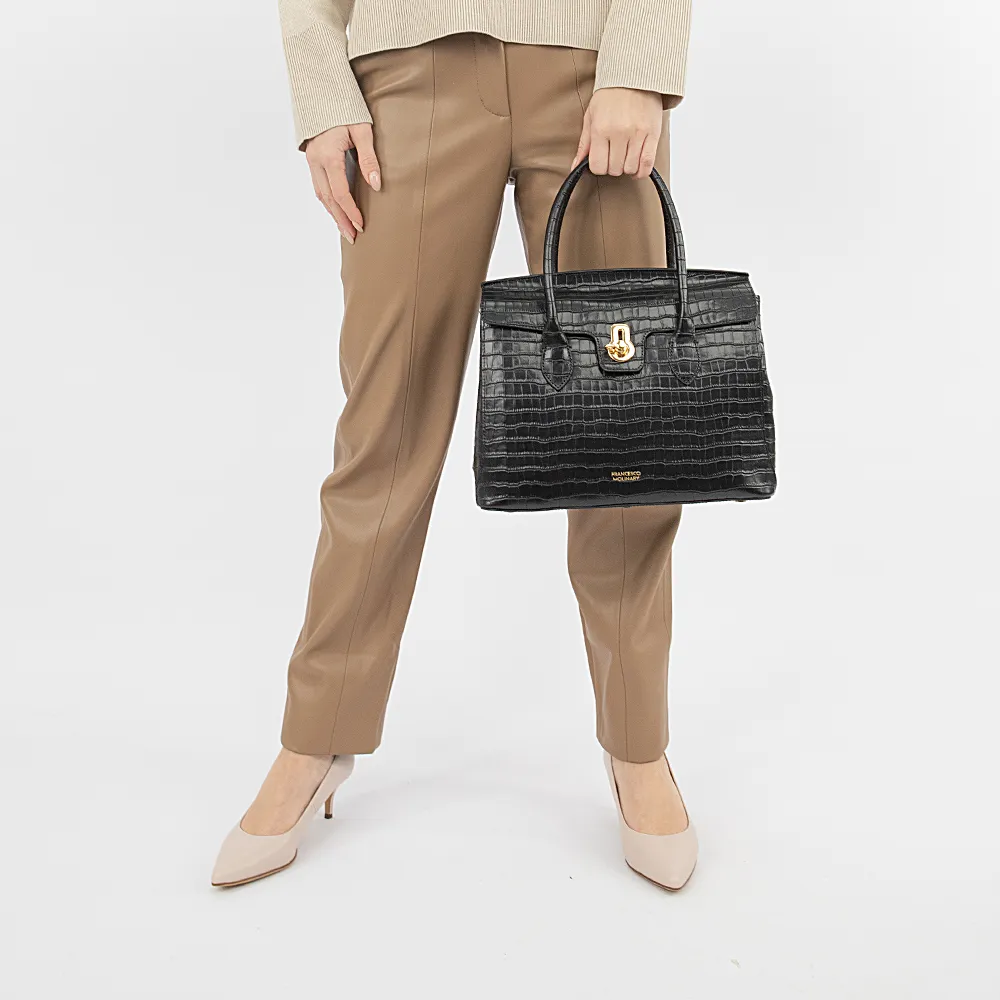 Сумка от торговой марки Francesco Molinary из натуральной кожи черного цвета с тиснением под крокодиловую кожу. Модель с двумя удлиненными плотными ручками, съемным регулируемым плечевым ремнем. Закрывается коротким клапаном на поворотном замке. Отделение на молнии. Внутри: фирменная подкладка, средник и карман на молнии, накладной карман. На задней стенке – карман на молнии. Дно оснащено металлическими ножками для защиты от износа.