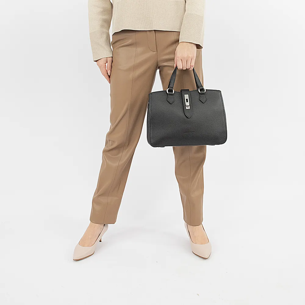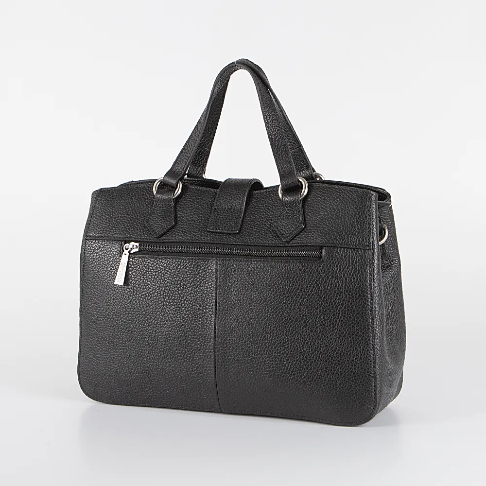 Сумка от торговой марки Francesco Molinary из натуральной кожи черного цвета. Модель с двумя ручками и съемным регулируемым плечевым ремнем. Закрывается хлястиком на поворотном замке. Отделение на молнии. Внутри: фирменная подкладка, средник и карман на молнии, два накладных кармана. На задней стенке – карман на молнии. На дне имеются нашивки для защиты от износа.