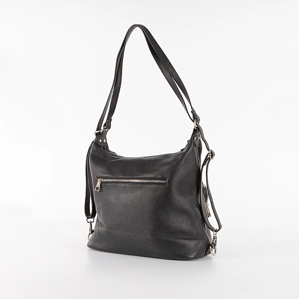 Сумка-рюкзак от торговой марки Valigetti из натуральной кожи черного цвета. Модель с одной ручкой и съемным регулируемым ремнем, выполняющим роль второй ручки и плечевых лямок. Отделение на молнии. Внутри: фирменная подкладка, средник и карман на молнии. На лицевой стороне – два кармана на молнии, накладной карман на магнитной кнопке. На задней стороне – карман на молнии. Широкое дно оснащено металлическими ножками для защиты от износа.