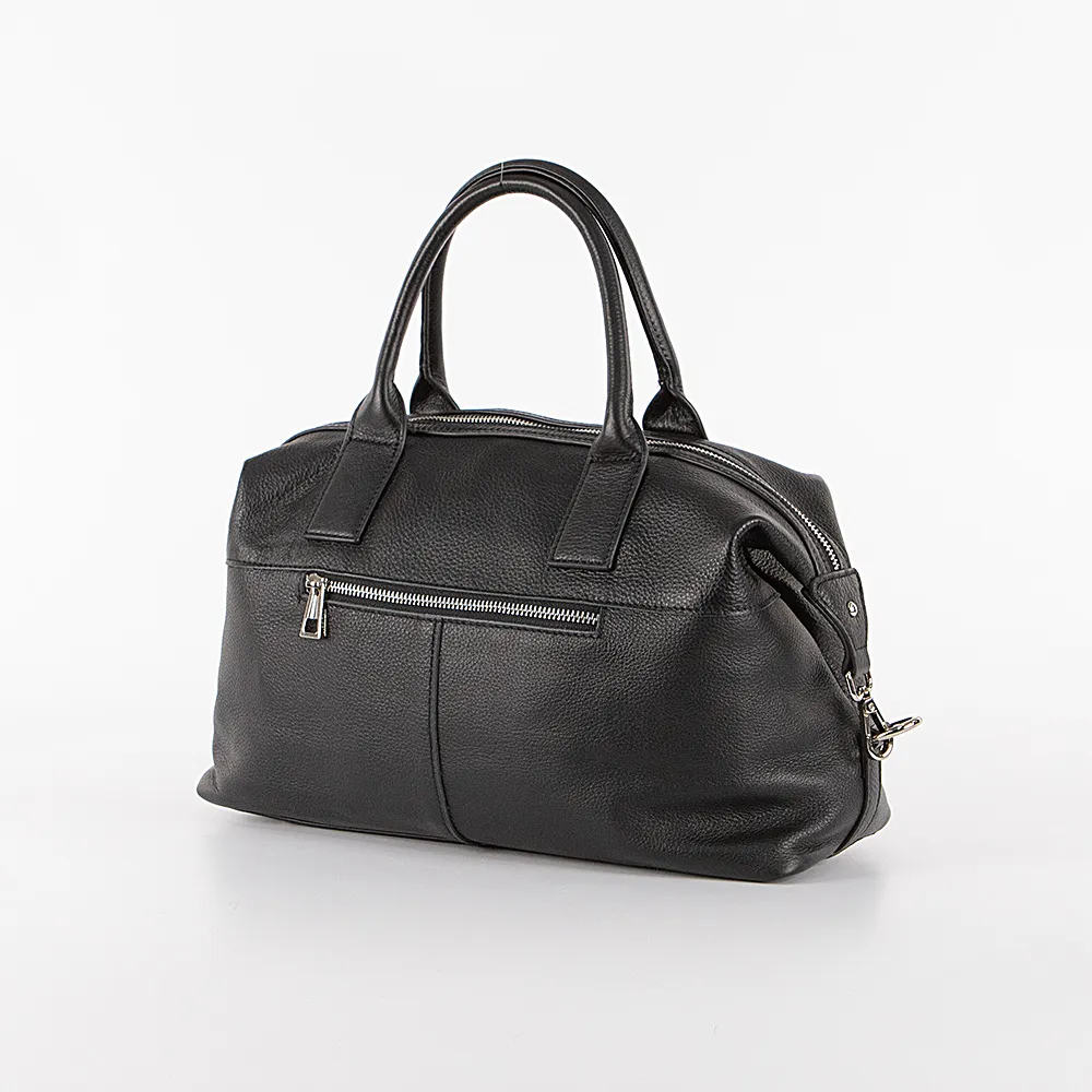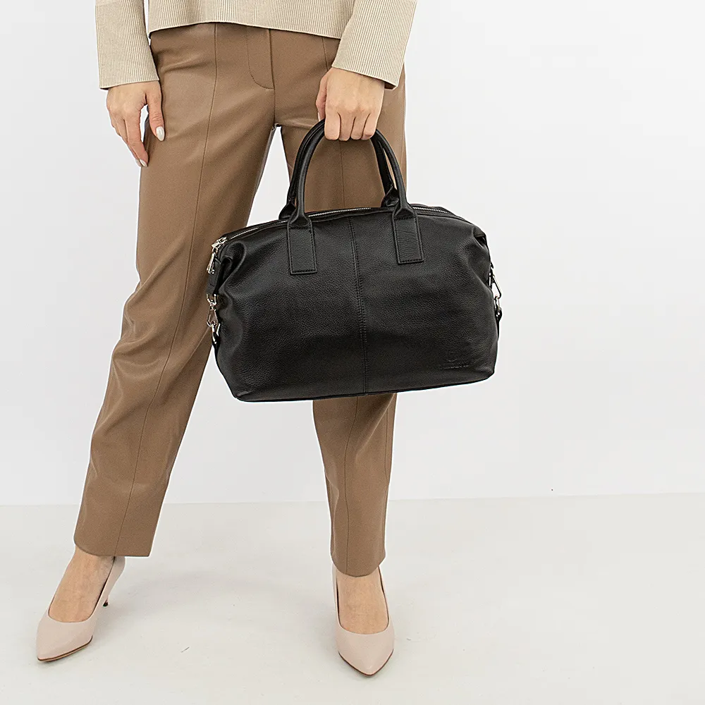 Сумка от торговой марки Valigetti из натуральной кожи черного цвета. Вместительная модель с двумя плотными ручками и съемным плечевым ремнем. Отделение на молнии с двумя встречными бегунками. Внутри: средник и карман на молнии, накладной карман. На задней стороне – карман на молнии. По бокам – карабины, с помощью которых можно менять форму и объем сумки. Дно оснащено металлическими ножками для защиты от износа.