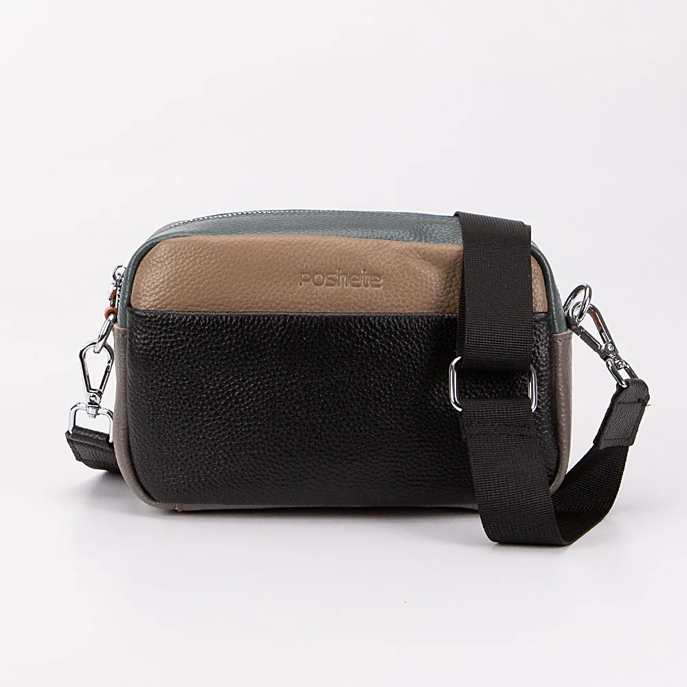 Сумка от торговой марки Poshete из натуральной кожи. Модель с широким съемным регулируемым плечевым ремнем, выполненным из текстильного материала. Отделение на молнии. Внутри: фирменная подкладка, карман на молнии, накладной карман. На лицевой стороне – накладной карман на магнитной кнопке. На задней стороне – карман на молнии.