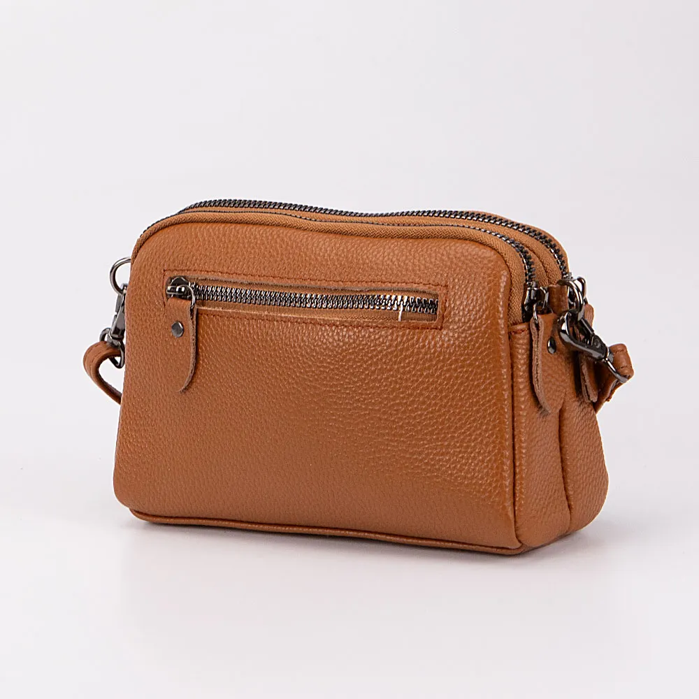 Сумка от торговой марки Poshete из натуральной кожи светло-коричневого цвета camel. Модель со съемным ремешком для запястья, съемным регулируемым плечевым ремнем. Два отделения на молнии, с текстильной подкладкой. В одном из них – карман на молнии, в другом – накладной карман. На задней стороне – карман на молнии.