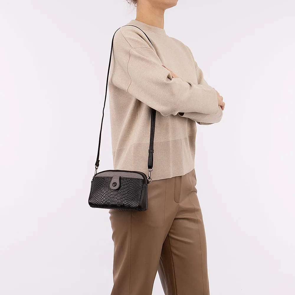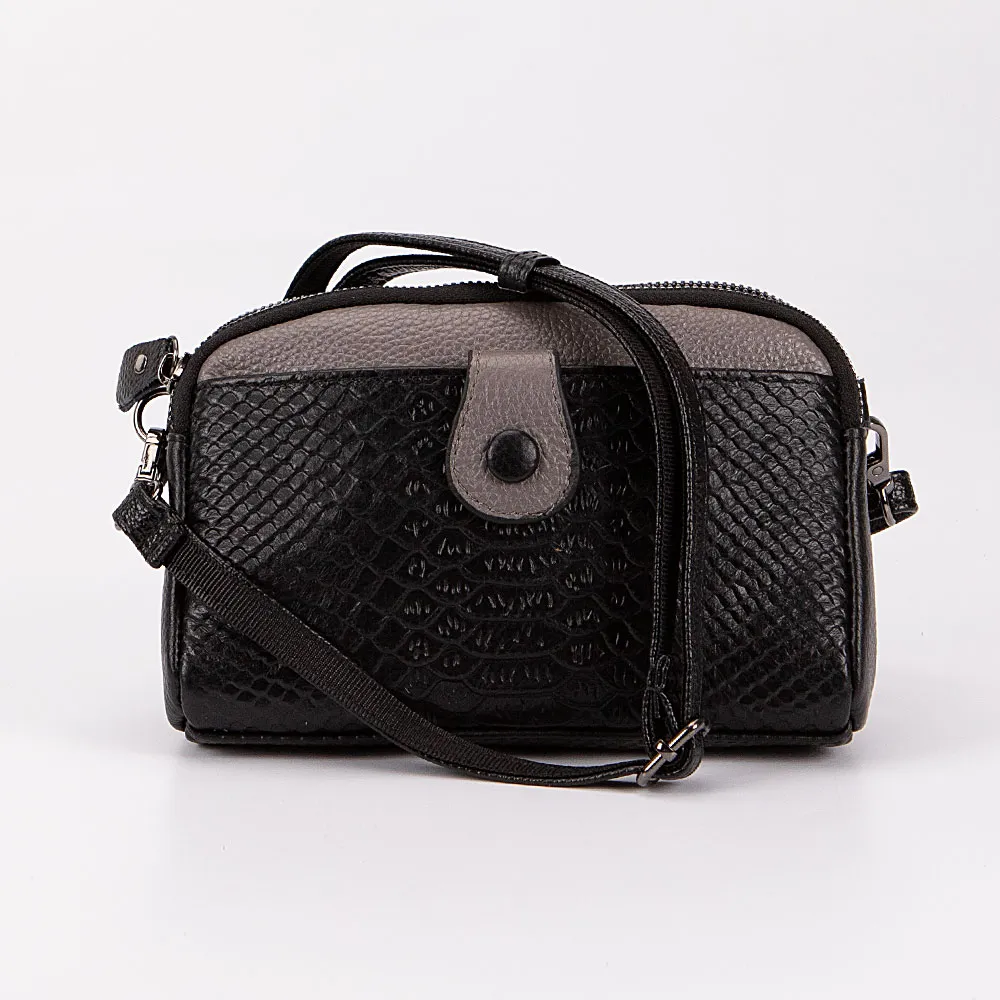 Сумка от торговой марки Poshete из натуральной кожи черного цвета. Компактная небольшая модель со съемным регулируемым плечевым ремнем и ремешком для запястья. Два отделения на молнии, с фирменной подкладкой. В заднем – карман на молнии, в переднем – накладной карман. На лицевой стороне – накладной карман с серым хлястиком на кнопке, декорированный тиснением под рептилию. На задней стороне – карман на молнии.