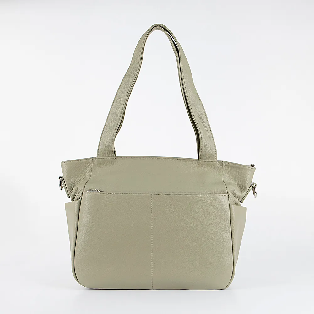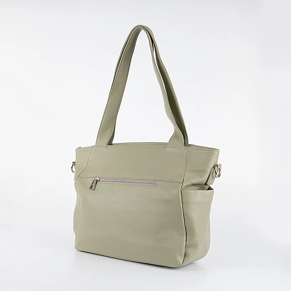 Сумка от торговой марки Valigetti из натуральной кожи. Модель с двумя удлиненными ручками. Отделение на молнии. Внутри: фирменная подкладка, перегородка и карман на молнии. На лицевой и задней сторонах – карман на молнии. По бокам – накладной карман. Дно оснащено металлическими ножками для защиты от износа.