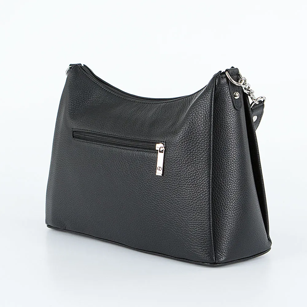 Сумка от торговой марки Francesco Molinary из натуральной кожи черного цвета. Модель с одной ручкой-цепочкой и съемным регулируемым плечевым ремнем. Отделение на молнии. Внутри: фирменная подкладка, карман на молнии, два накладных кармана. На задней стороне – карман на молнии. Дно оснащено металлическими ножками для защиты от износа.