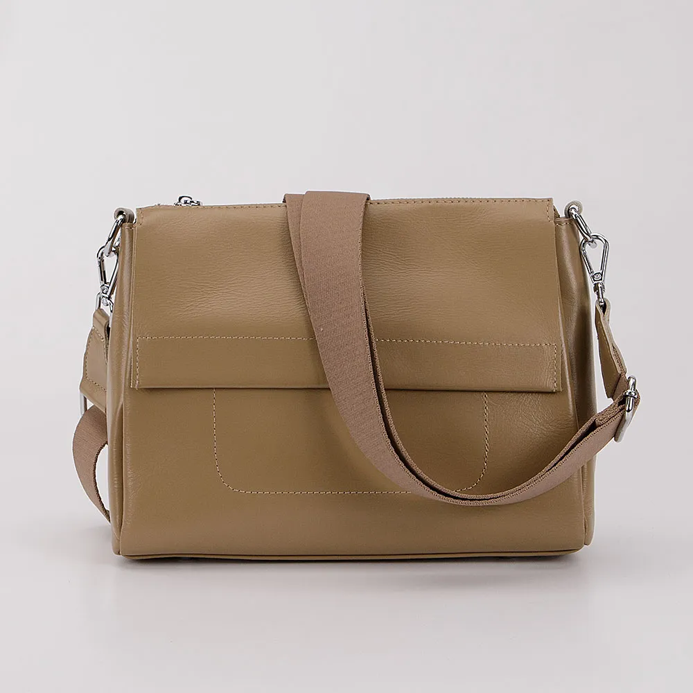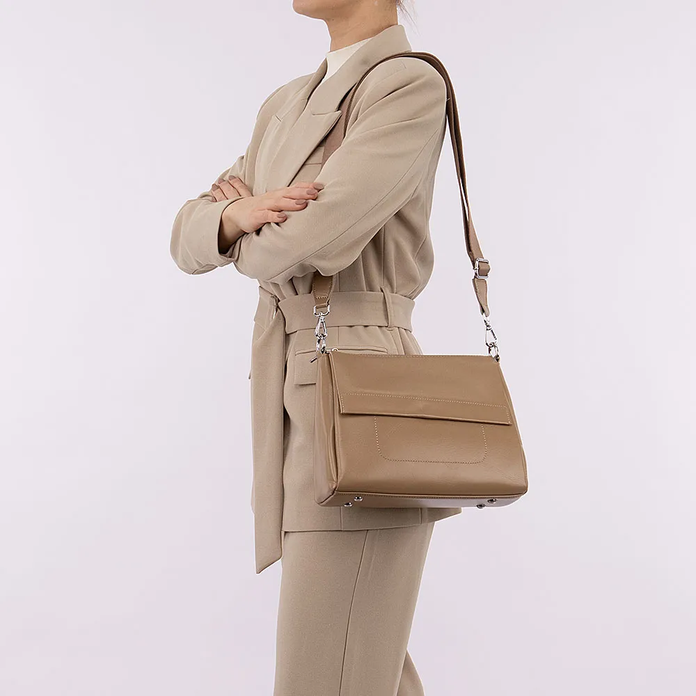 Сумка от торговой марки Poshete из натуральной кожи кофейного цвета. Модель со съемной ручкой и съемным регулируемым плечевым ремнем, выполненным из текстильного материала. Закрывается молнией. Внутри: три отсека с текстильной подкладкой; в среднем отсеке – карман на молнии, накладной карман. На лицевой стороне – декоративный клапан на магнитной кнопке. На задней стороне – карман на молнии. Дно оснащено металлическими ножками для защиты от износа.