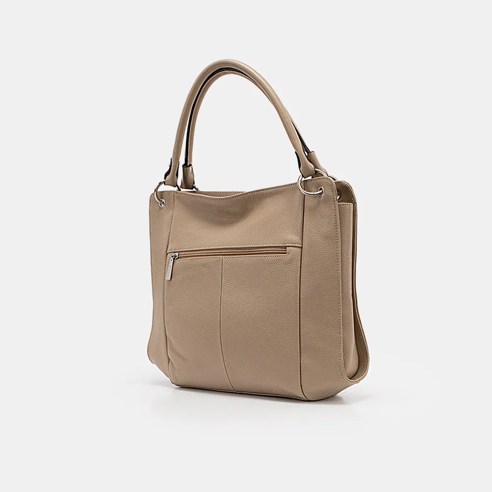 Сумка от торговой марки Francesco Molinary из натуральной кожи бежевого цвета. Модель с несъемным регулируемым плечевым ремнем. Два отделения на молнии, с фирменной подкладкой. В заднем отделении – карман на молнии, в переднем – накладной карман. На лицевой и задней сторонах – карман на молнии. Дно оснащено металлическими ножками для защиты от износа.