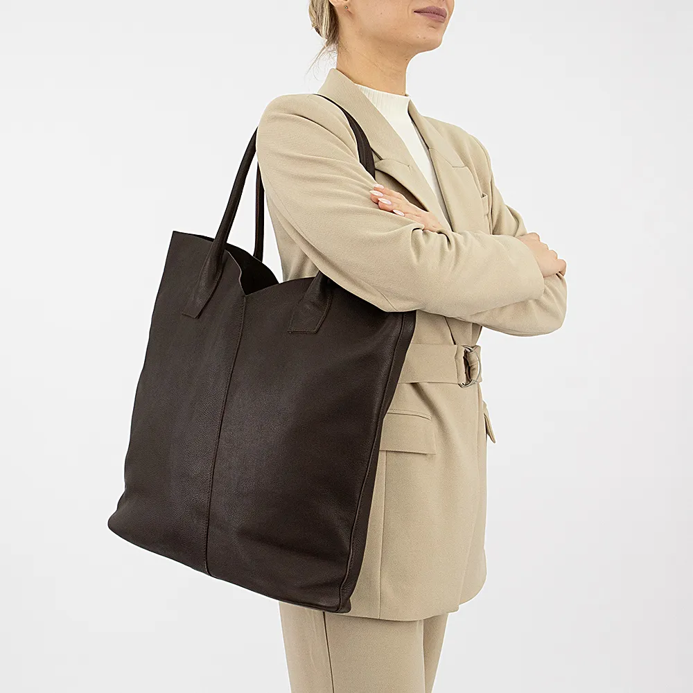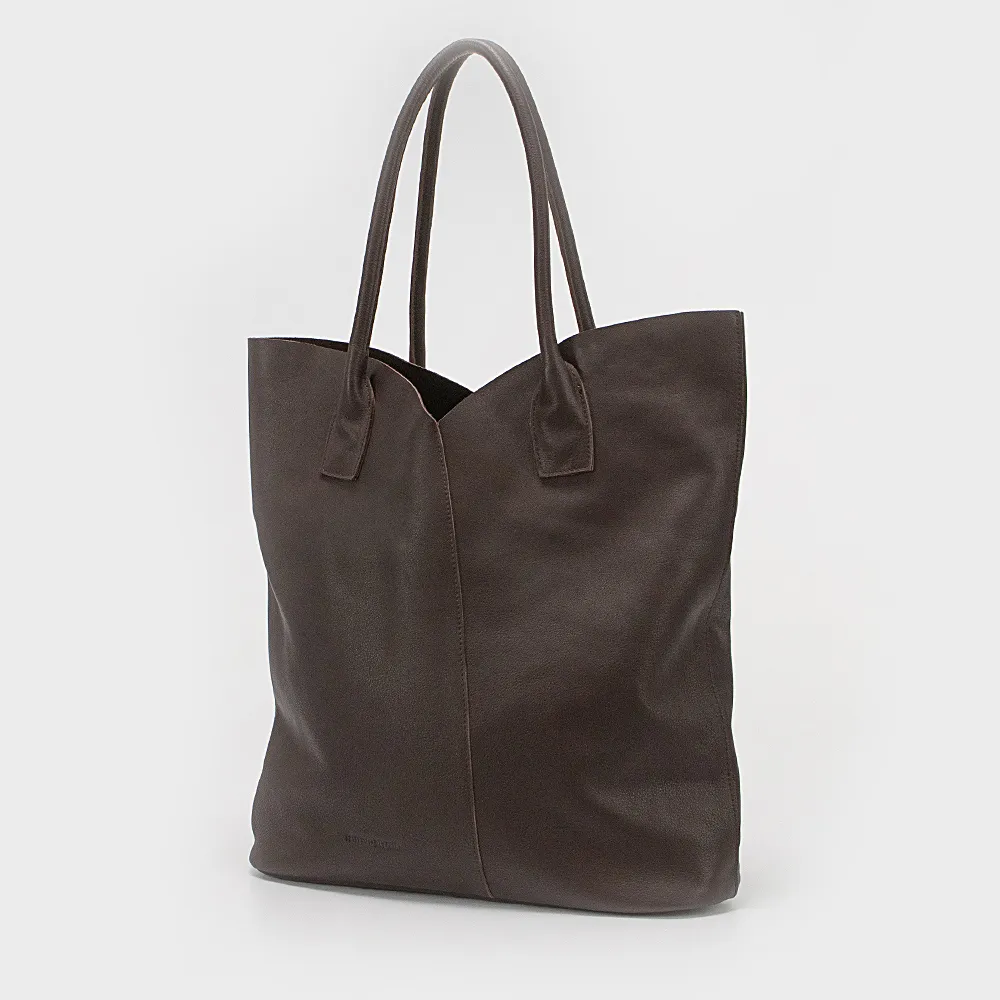 Сумка от торговой марки Francesco Molinary из натуральной кожи коричневого цвета. Большая вместительная модель с двумя удлиненными ручками. Отделение на молнии, без подкладки. В комплекте имеется съемная косметичка, которая фиксируется четырьмя кнопками; внутри: карман на молнии, два накладных кармана. Усиленное дно овальной формы.