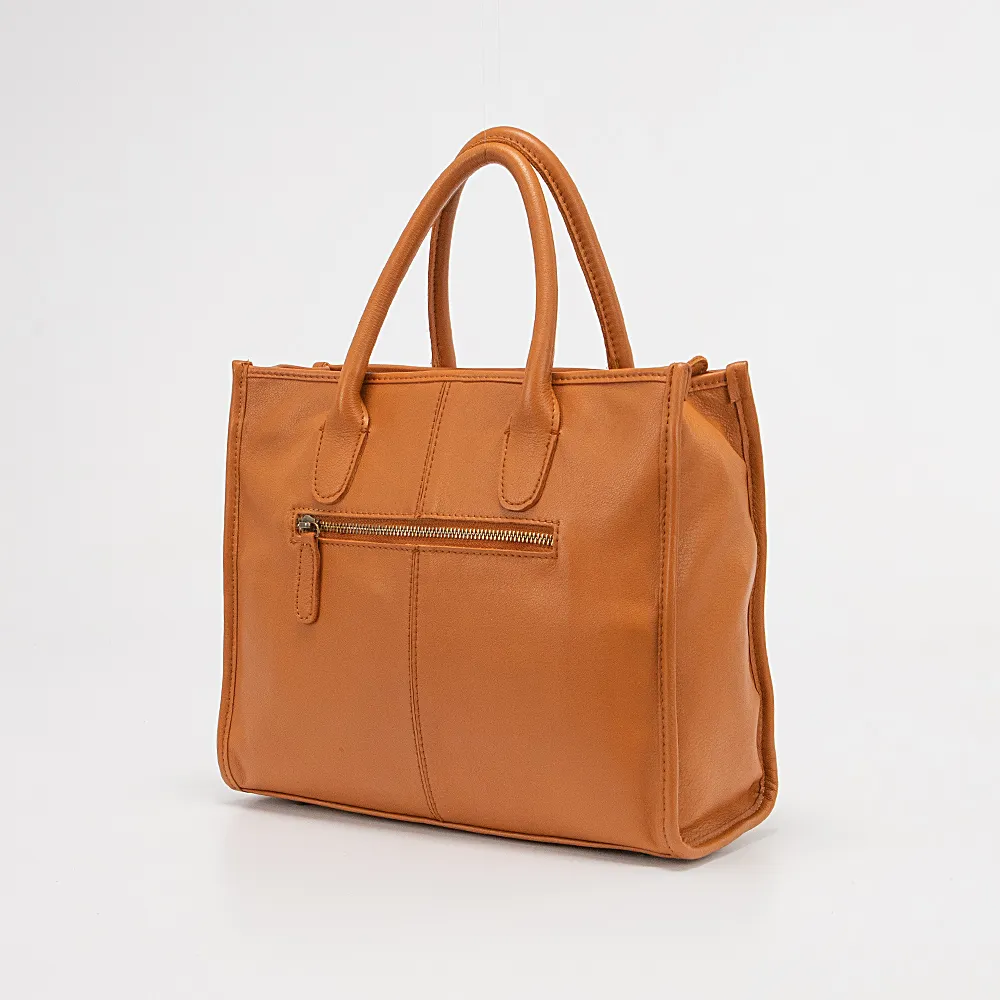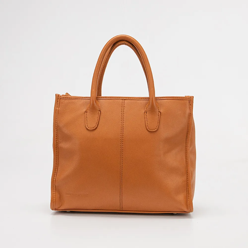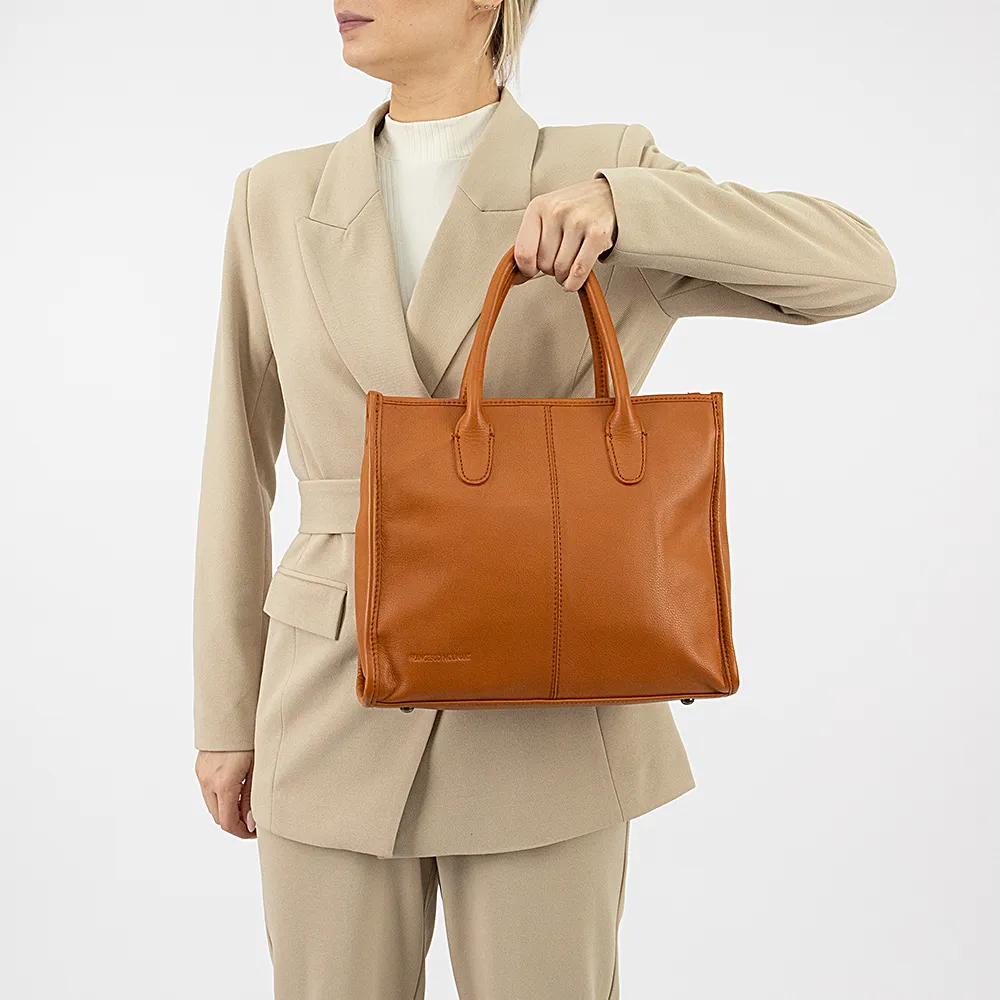 Сумка от торговой марки Francesco Molinary из натуральной кожи цвета dark camel. Модель с двумя ручками и съемным регулируемым плечевым ремнем. Отделение на молнии. Внутри: фирменная подкладка, карман на молнии, накладной карман, перегородка с карманом на молнии, образующая накладной карман. На задней стороне – карман на молнии. Дно оснащено металлическими ножками для защиты от износа.