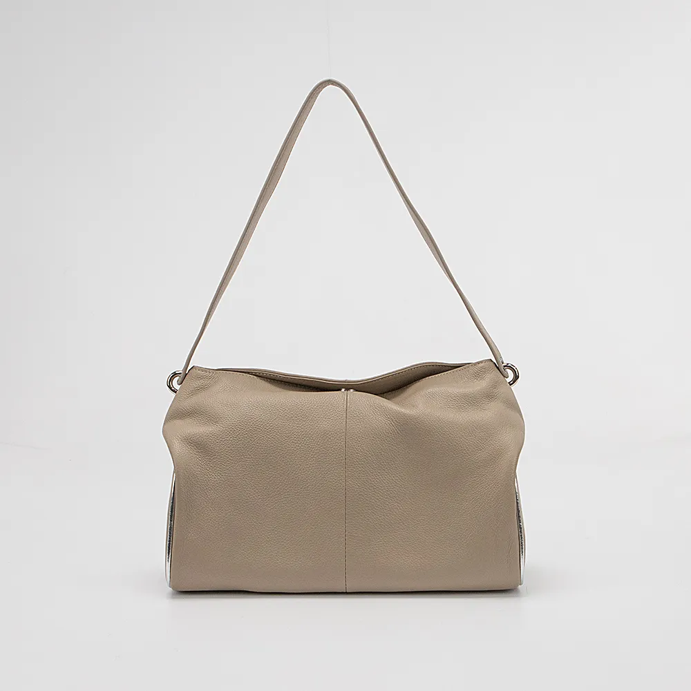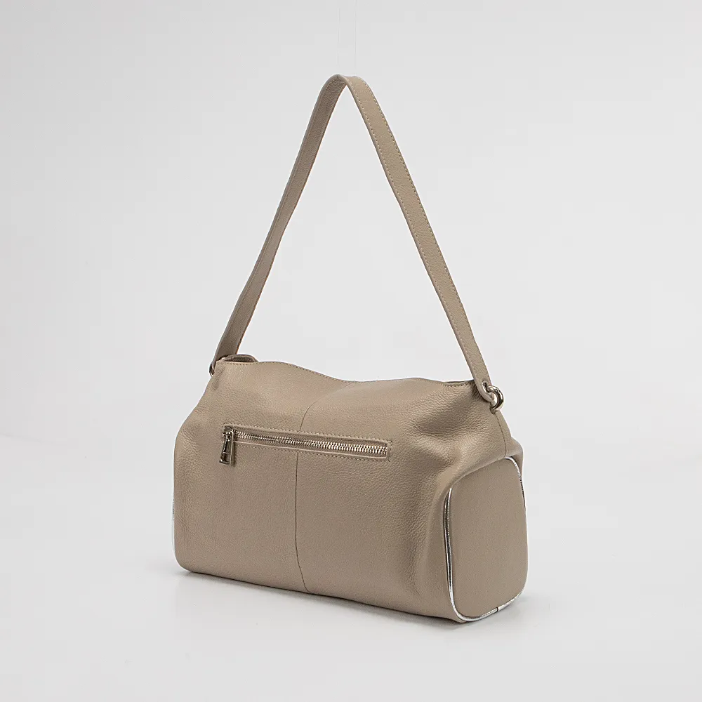 Сумка от торговой марки Poshete из натуральной кожи кофейного цвета. Модель с удлиненной ручкой и съемным регулируемым плечевым ремнем. Отделение на молнии; дополнительно фиксируется магнитной кнопкой. Внутри: средник и карман на молнии, два накладных кармана. На задней стороне – карман на молнии. По бокам модель декорирована серебристой окантовкой.