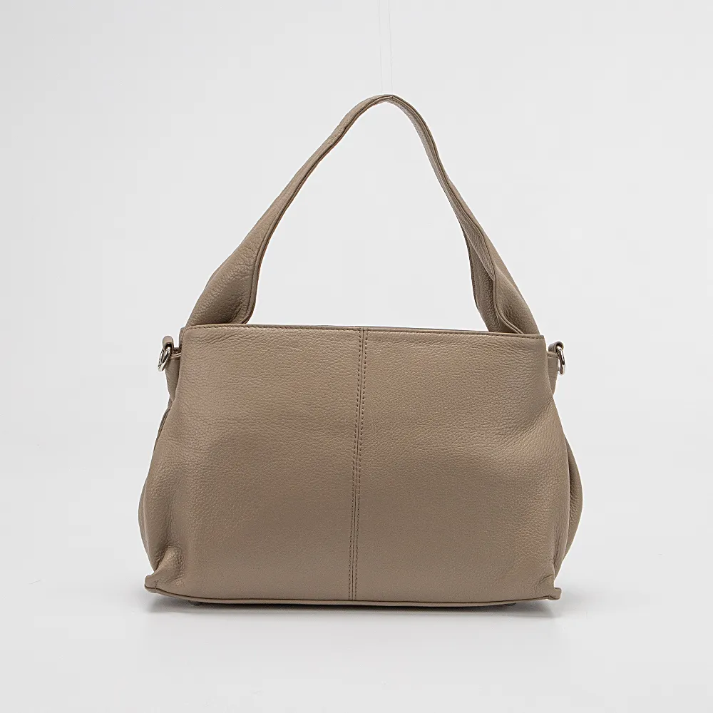 Сумка от торговой марки Poshete из натуральной кожи кофейного цвета. Модель с одной широкой ручкой и съемным регулируемым плечевым ремнем. Отделение на молнии. Внутри: текстильная подкладка, средник и карман на молнии, два накладных кармана. На задней стороне – карман на молнии. Дно оснащено металлическими ножками для защиты от износа.