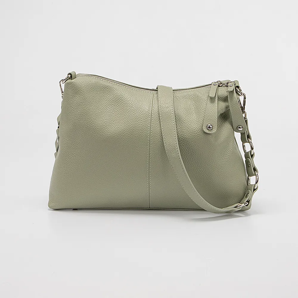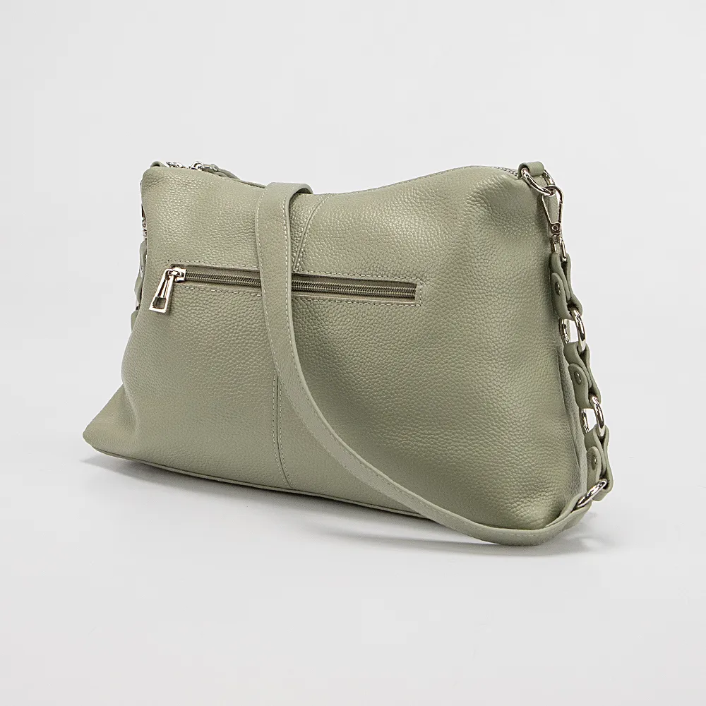 Сумка от торговой марки Poshete из натуральной кожи светло-зеленого цвета. Модель с несъемным регулируемым плечевым ремнем, комбинированным колечками. Отделение на молнии. Внутри: текстильная подкладка, средник и карман на молнии, два накладных кармана. На задней стороне – карман на молнии. Дно оснащено металлическими ножками для защиты от износа.