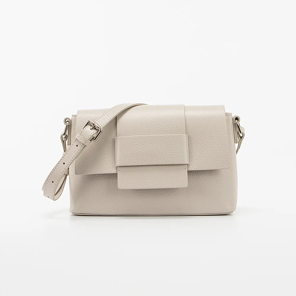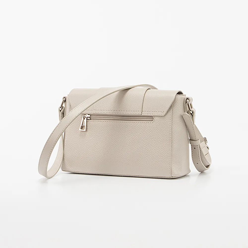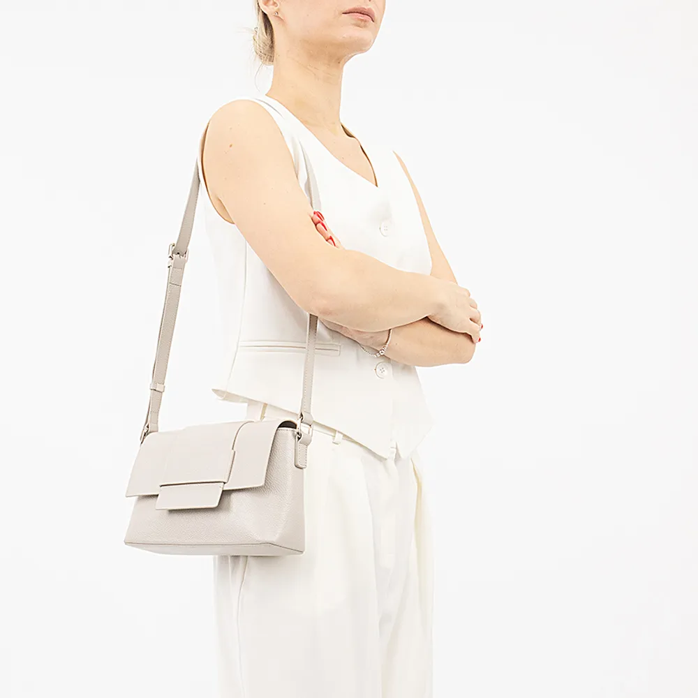 Сумка от торговой марки Poshete из натуральной кожи светло-серого цвета. Модель с несъемным регулируемым плечевым ремнем. Закрывается клапаном на магнитной кнопке. Отделение на молнии. Внутри: фирменная подкладка, карман на молнии, накладной карман. На задней стороне – карман на молнии.