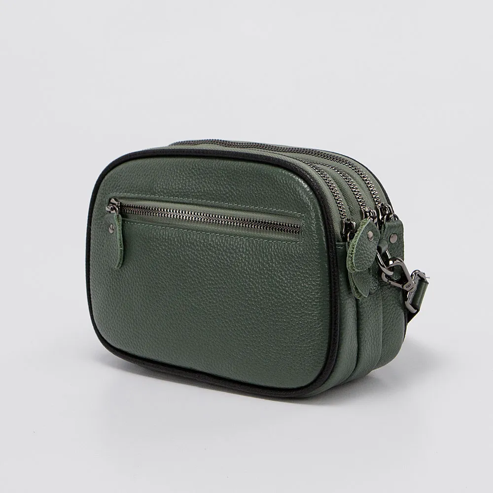 Сумка от торговой марки Poshete из натуральной кожи мятно-зеленого цвета. Лицевая сторона декорирована ромбовидной стежкой. Модель с широким съемным регулируемым плечевым ремнем, выполненным из текстильного материала с контрастной окантовкой. Три отделения на молнии, с фирменной подкладкой. В заднем – карман на молнии, в переднем – накладной карман. На задней стороне – карман на молнии.