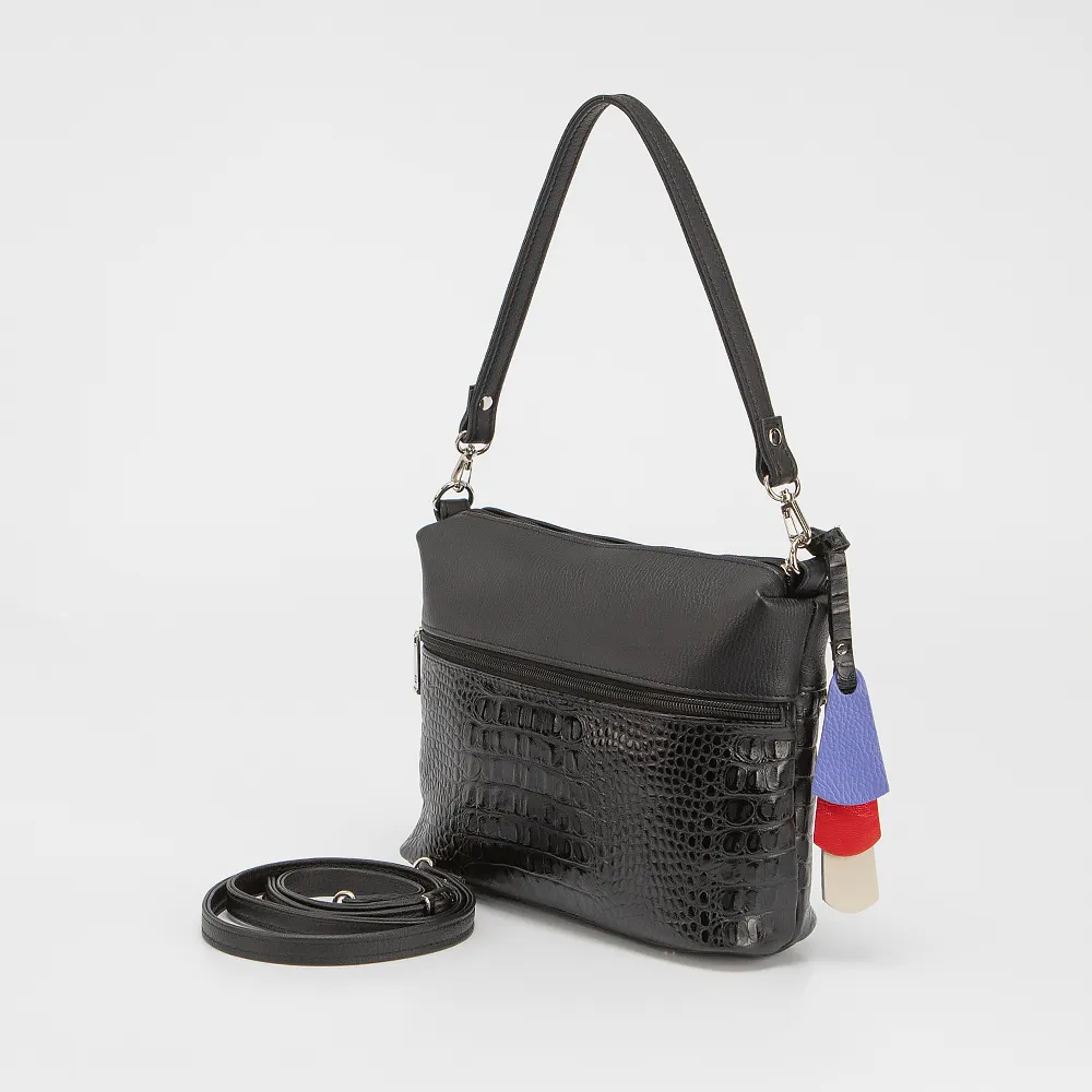 Сумка от торговой марки Francesco Molinary выполнена из натуральной кожи черного цвета с частичным тиснением под рептилию. Модель с удлиненной ручкой и съемным регулируемым плечевым ремнем. Декорирована цветными кожаными подвесками. Отделение на молнии. Внутри: фирменная текстильная подкладка, карман на молнии, накладной карман. С лицевой и задней стороны - карман на молнии. Дно оснащено металлическими ножками для защиты от износа.