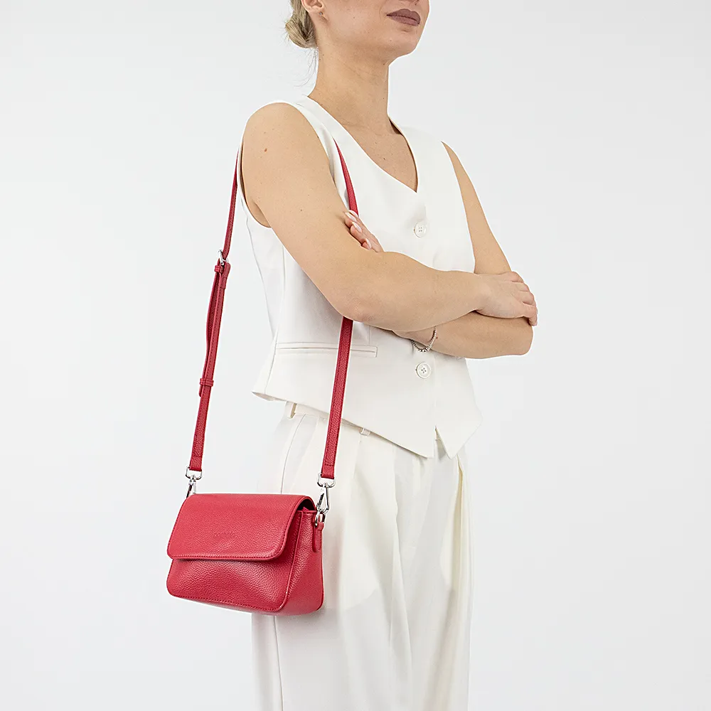 Сумка от торговой марки Poshete из натуральной кожи красного цвета. Модель с изящным съемным регулируемым плечевым ремнем. Закрывается клапаном на магнитной кнопке. Отделение на молнии. Внутри: фирменная подкладка, карман на молнии, накладной карман.
