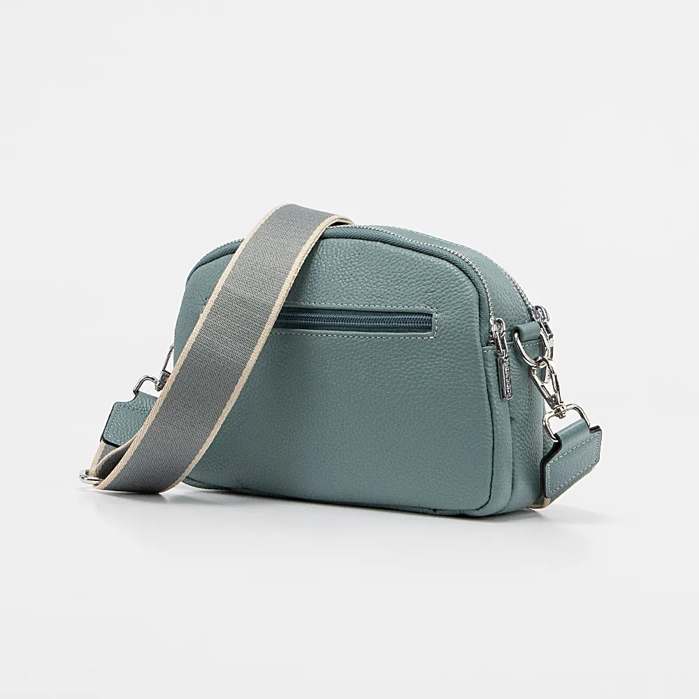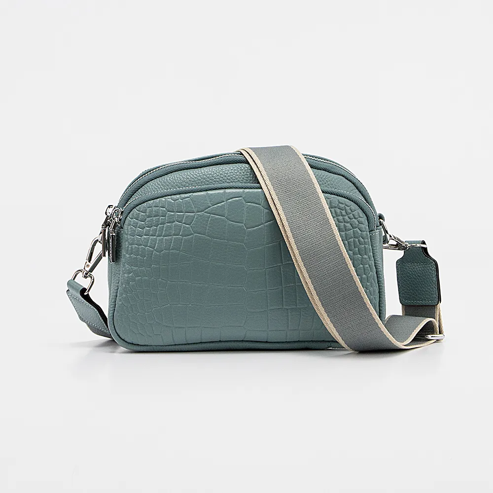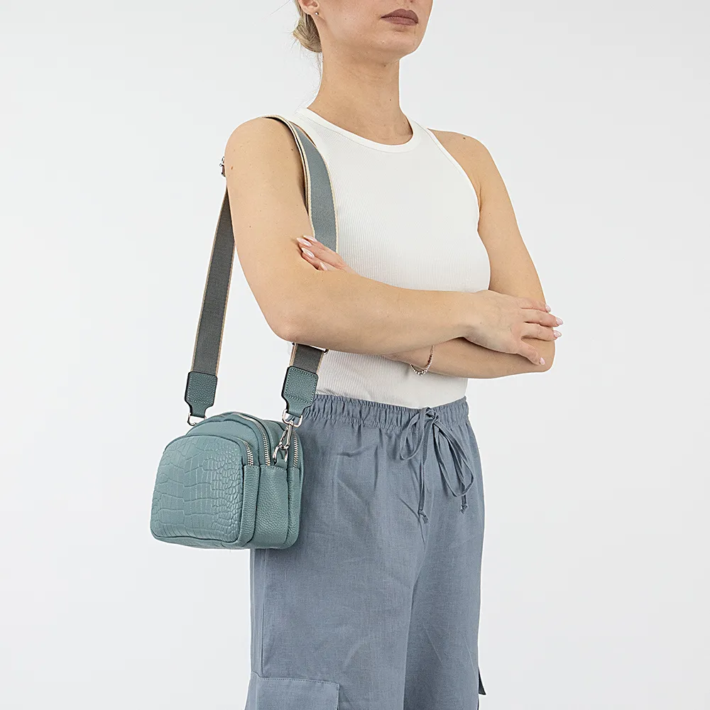 Сумка от торговой марки Poshete из натуральной кожи голубого цвета. Модель с широким съемным регулируемым плечевым ремнем, выполненным из текстильного материала с окантовкой по краям. Два отделения на молнии, с фирменной подкладкой. В заднем отделении – карман на молнии, в переднем – накладной карман. На лицевой и задней сторонах – карман на молнии; передний карман декорирован тиснением под крокодиловую кожу.